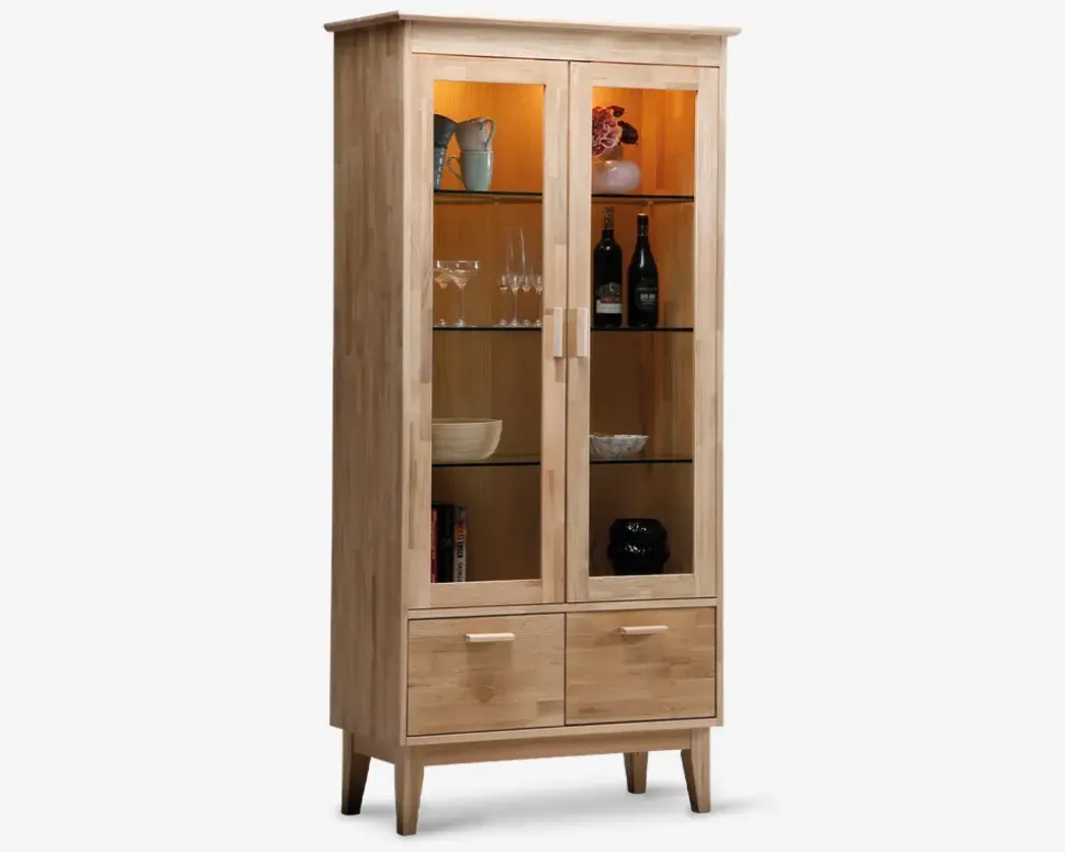 En flot vitrine i massiv stavlimet eg, med døre i fineret eg, og finish i hvid olieret. Vitrinen passer fint ind i stilen med et af vores plankeborde. Her får du mulighed for masser af opbevaring, 2 rumlige skuffer samt de 3 hylder som kan justeres en smule i højden, giver mulighed for opbevaring af service og glas, i spisestuen hvor du ofte benytter det. Både skuffer og låger leveres med softclose, som giver en eksklusiv følelse, og samtidig sikre at døren ikke smækker i med et brag. På alle hylder er der monteret LED lys, som giver en hygge til stuen, når mørket falder på.Vitrinen leveres usamlet, og vi anbefaler at I er 2 når vitrinen skal samles og flyttes. Den træet er hvidolieret fra producenten, men vi anbefaler at du behandler vitrinen med hvid olile før du tager den i brug., på den måde sikre du den stærkeste overflade. Du bør desuden for at holde den lyse farve, efterbehandle vitrinen 1 til 2 gange om året. Det kan være svært at sige hvor ofte det skal ske, det afhænger meget af placeringen af møblet, står det i direkte solskin en del af dagen, eller tæt på en varme kilde, kan det være nødvendigt at behandle træet oftere. De er vigtigt at du følger vejledningen på det produkt du vælger at efterbehandle med. Ege træ er en hård træsort, og den ridses ikke nemt, skulle uheldet være ude kan træet slibes ned, og derefter hvidolieres igen, dette er et stort arbejde, hvorfor man med fordel bør forsøge at undgå skader.