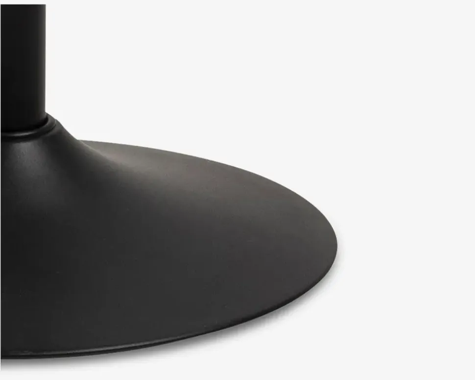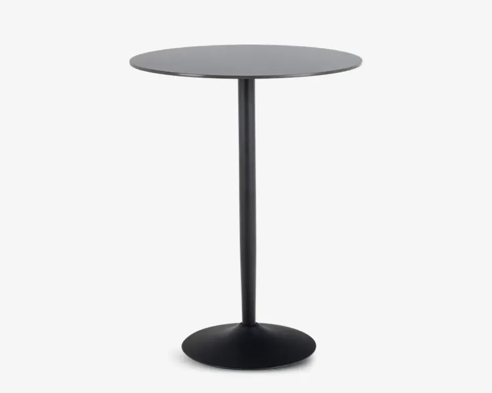Smart barbord med en bordplade i sort keramik, og sort trompet stel i stål. Barborde er blevet en del af indretningen i de danske hjem, og dette barbord er perfekt om du skal bruge det i stuen, entreen eller herrerummet. Bordet kan med sine 80 cm i dia., placeres mange steder i hjemmet, og højden på 105 cm gør et anvendeligt uanset om du står, eller kombinerer det med en af vores mange barstole.Barbordet kræver ingen vedligeholdelse, og rengøres med en klud vredet op i rent vand, du kan med fordel tørre efter med en tør klud, på den måde undgår du mærker fra kalken i vandet. Bordpladen er robust og holdbar overfor væsker.