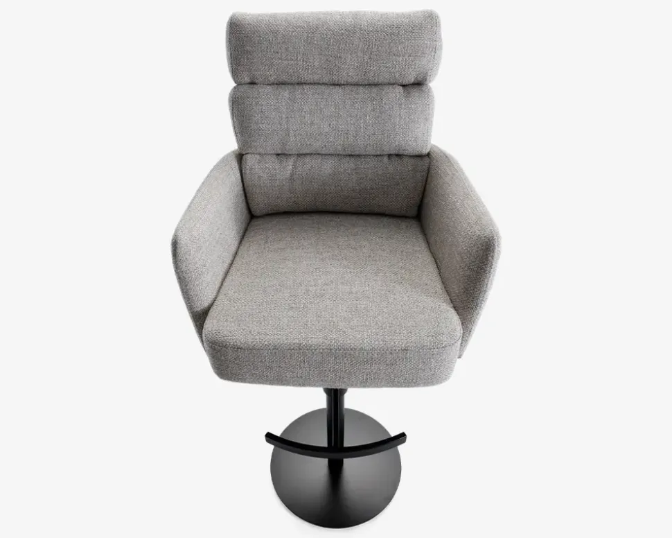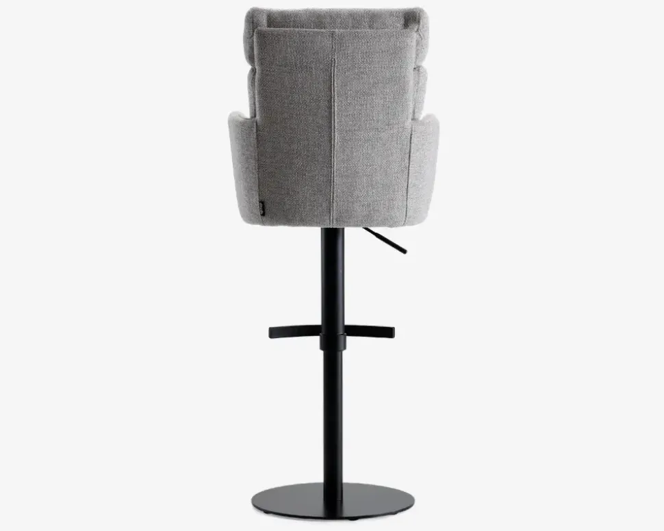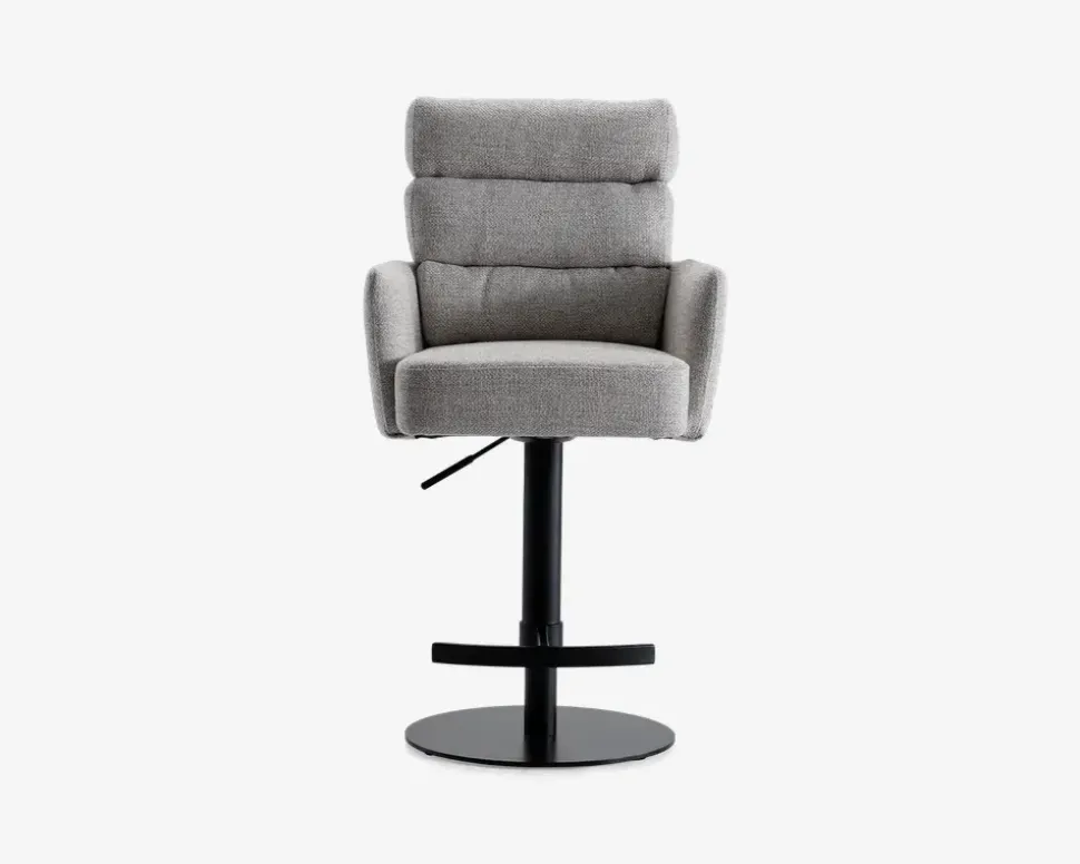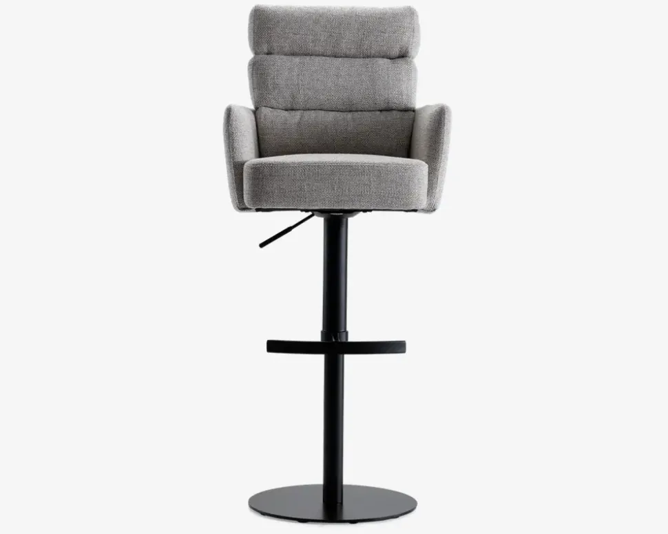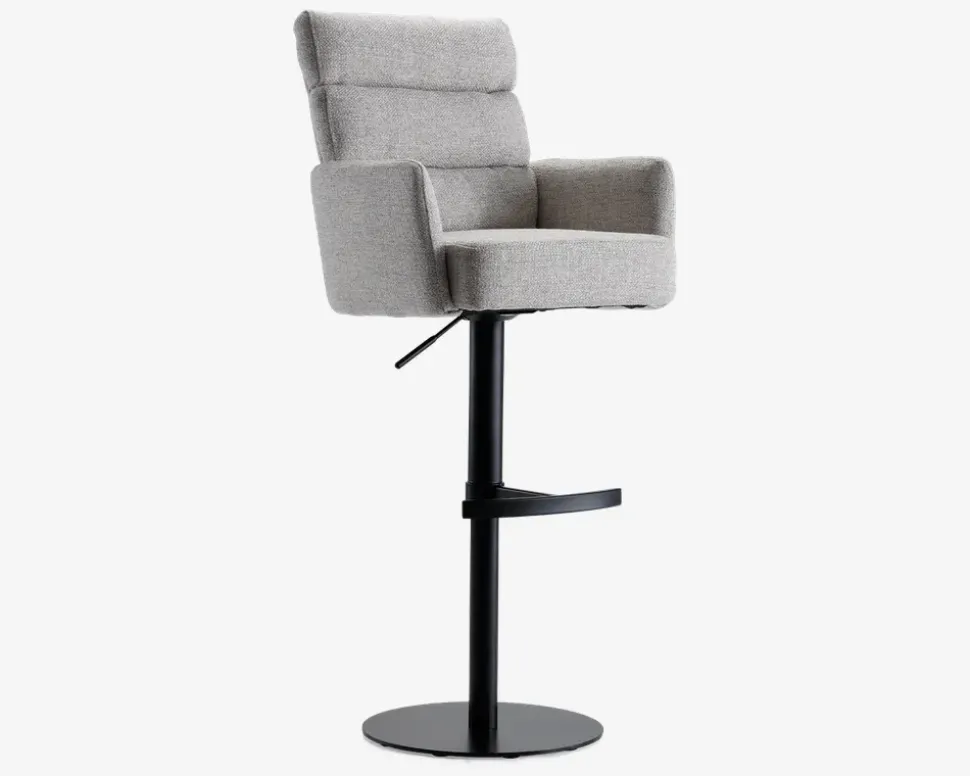 Denne barstol er en del af vores Daells Collection. Daells Collection er en serie af møbler som vi er specielt stolte af at kunne præsenterer. De udmærker sig ved at være en fremragende kvalitet, flot design og gode til prisen.Barstolen her er med armlæn, og stellet har 360° rotation og fodstøtte. I sædet er barstolen fremstillet med posefjedre, som giver en helt fantastisk siddekomfort, som understøttes af den bløde polsteret ryg. Stoffet er et kraftigt møbelstof som findes i 2 farver, beige og grå. Barstolen kræver ingen vedligeholdelse, og samles nemt med 4 skruer.