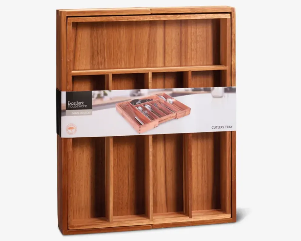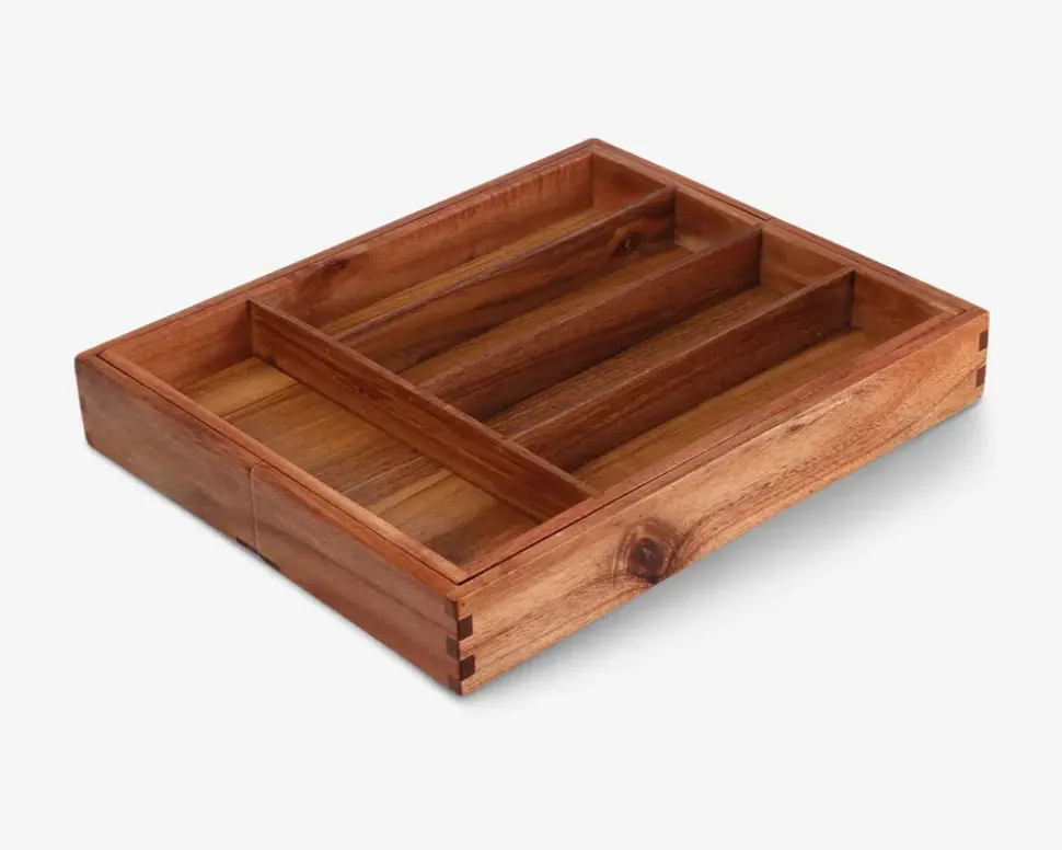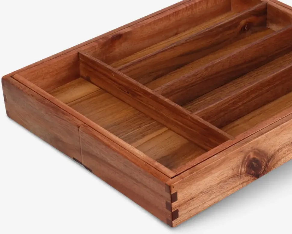 Bestikbakke i akacietræ der både er funktionel og æstetisk. Den kan bruges som en standard bestikbakke med en brede på 28 cm, men har også en udtrækkelig funktion, så du nemt kan forlænge den til 45 cm. Bakken giver dig mulighed for at organisere dit bestik på en praktisk og stilfuld måde.