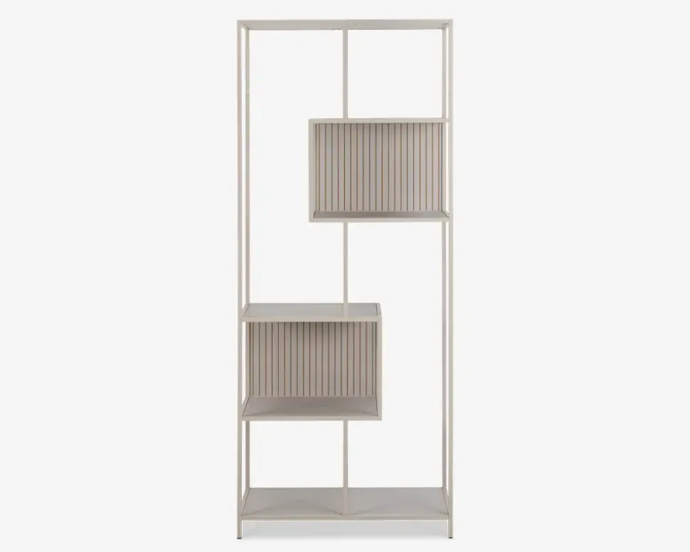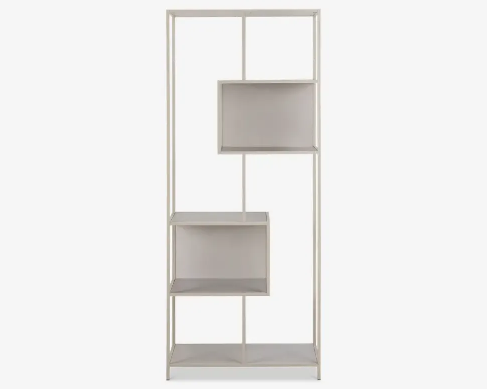 Fritstående reol i grå pulverlakeret metal med hylder i grå melamin. Hylderne er placeret asymmetrisk, som i sig selv er meget skulpturelt. Det giver reolen en meget dekorativt udseende og giver et flot og anderledes look. Bagbeklædningen er vendbar, så man kan have en glat overflade eller en rillet overflade, som giver et mere eksklusivt udtryk.Reolen kan selvfølgelig også stilles langs en væg og sammensættes med de andre reoler i denne serie.• Fritstående reol.• Grå pulverlakeret metalstel• Hylder i grå melamin• Dekorativt udseende• Leveres usamlet, men samles nemt• Mål i cm. B.78 x D.35 x H.185