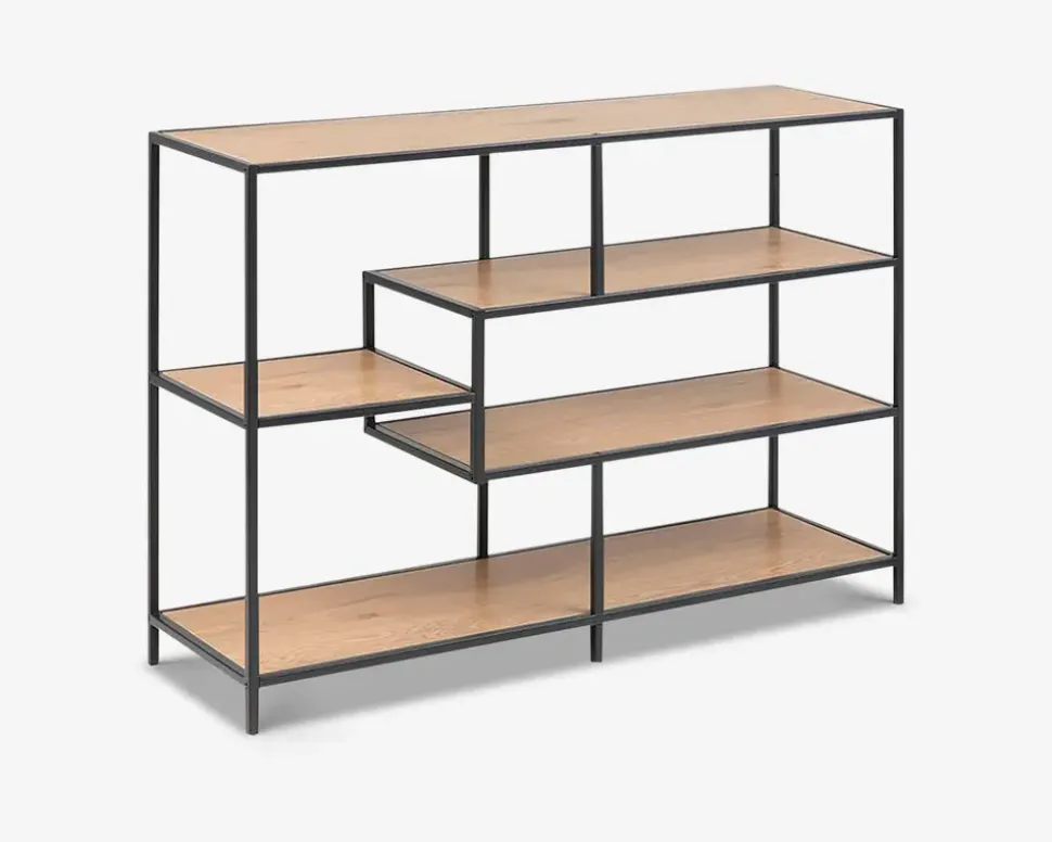 Fritstående reol i sort lakeret metal med hylder i vild eg farvet kunstfiner. Hylderne er placeret asymmetrisk, som i sig selv er meget skulpturelt. Det giver reolen en meget dekorativt udseende og giver et flot og anderledes look. Reolen kan selvfølgelig også stilles langs en væg.I denne serie kan der fås mange forskellige møbler, som gør det muligt at møblere de fleste rum i hjemmet med lige netop denne serie. Serien består af meget ”lette” møbler som kan give et enkelt og flot udtryk overalt i hjemmet. Flere typer sofaborde, tv-borde, reoler, serveringsvogne, skriveborde. Med denne serie er det nemt at indrette sig hyggeligt og praktisk på samme tid.• Fritstående reol.• Sortlakeret metalstel• Hylder i lys vild eg farvet kunstfiner• Dekorativt udseende• Leveres usamlet, men samles nemt• Mål i cm. B.114 x D.35 x H.78