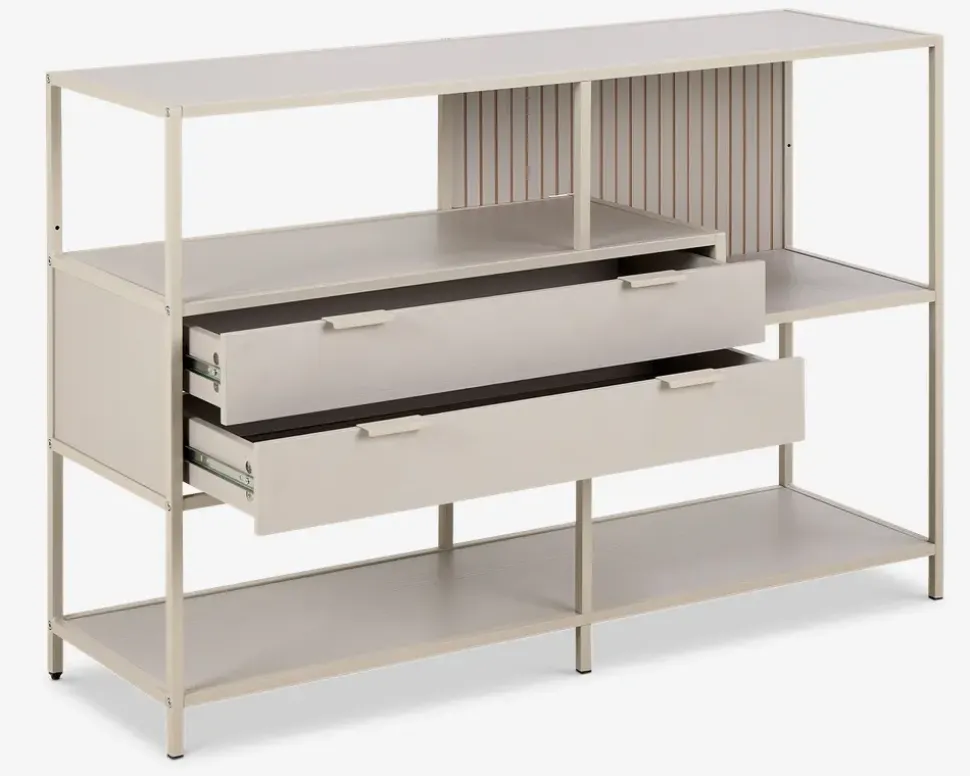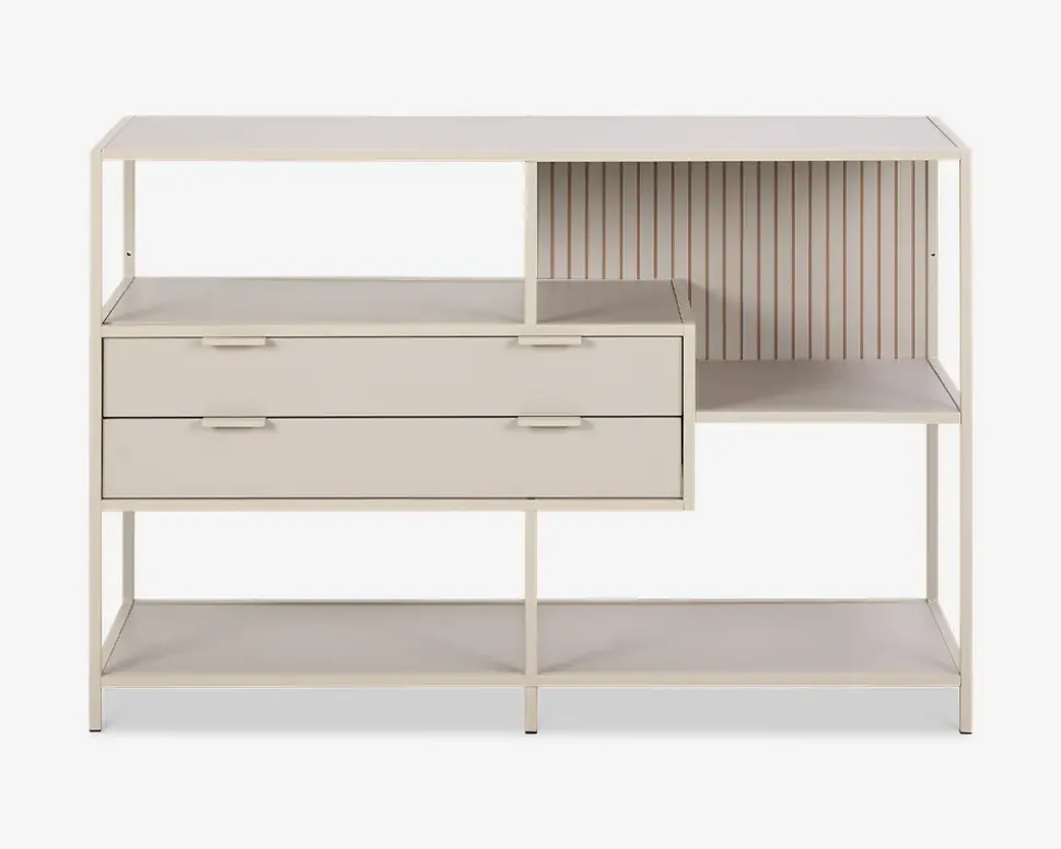 Fritstående reol i grå pulverlakeret metal med hylder i grå melamin. Hylderne er placeret asymmetrisk, som i sig selv er meget skulpturelt. Det giver reolen en meget dekorativt udseende og giver et flot og anderledes look. Bogreolen har også 2 gode skuffer. Bagbeklædningen er vendbar, så man kan have en glat overflade eller en rillet overflade, som giver et mere eksklusivt udtryk.Reolen kan selvfølgelig også stilles langs en væg og sammensættes med de andre reoler i denne serie.• Fritstående reol.• Grå pulverlakeret metalstel• Hylder i grå melamin• Dekorativt udseende• Leveres usamlet, men samles nemt• Mål i cm. B.114 x D.35 x H.78
