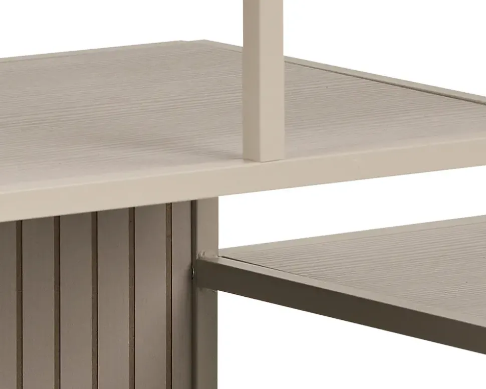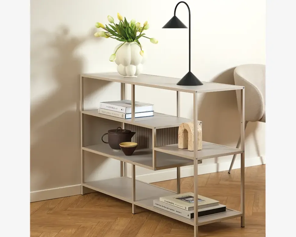 Fritstående reol i grå pulverlakeret metal med hylder i grå melamin. Hylderne er placeret asymmetrisk, som i sig selv er meget skulpturelt. Det giver reolen en meget dekorativt udseende og giver et flot og anderledes look. Bagbeklædningen er vendbar, så man kan have en glat overflade eller en rillet overflade, som giver et mere eksklusivt udtryk.Reolen kan selvfølgelig også stilles langs en væg og sammensættes med de andre reoler i denne serie.• Fritstående reol.• Grå pulverlakeret metalstel• Hylder i grå melamin• Dekorativt udseende• Leveres usamlet, men samles nemt• Mål i cm. B.114 x D.35 x H.78
