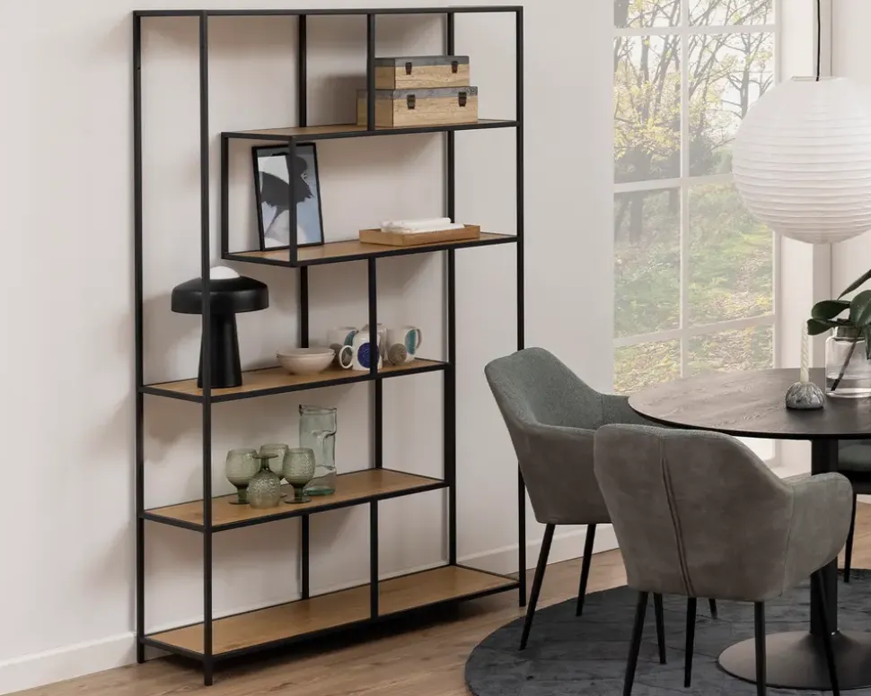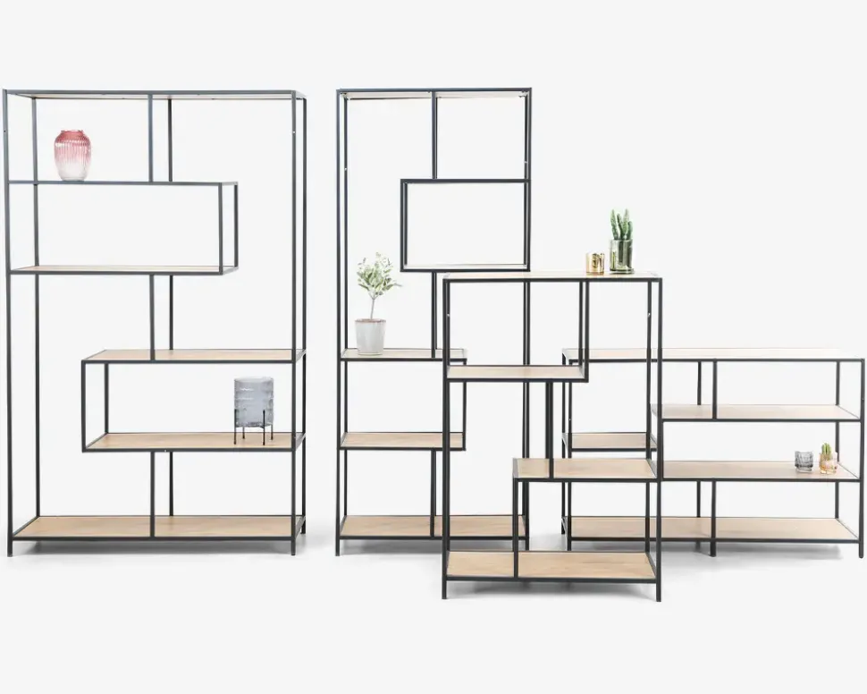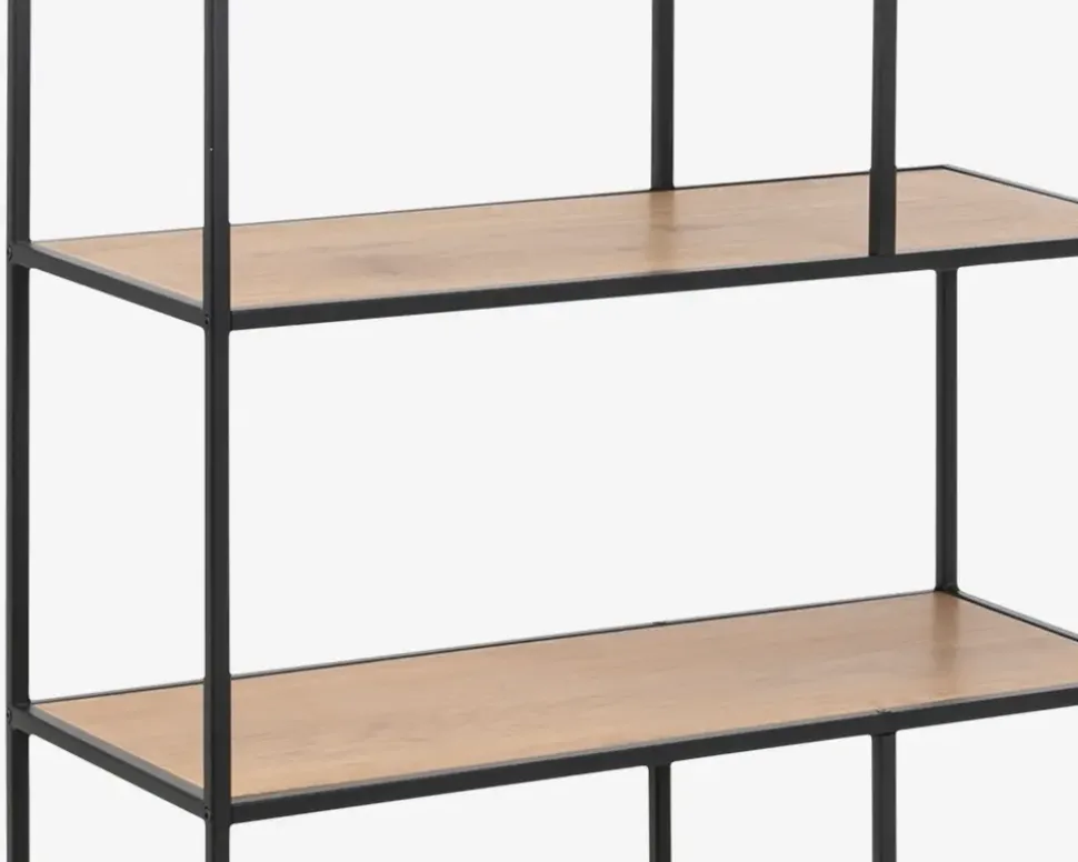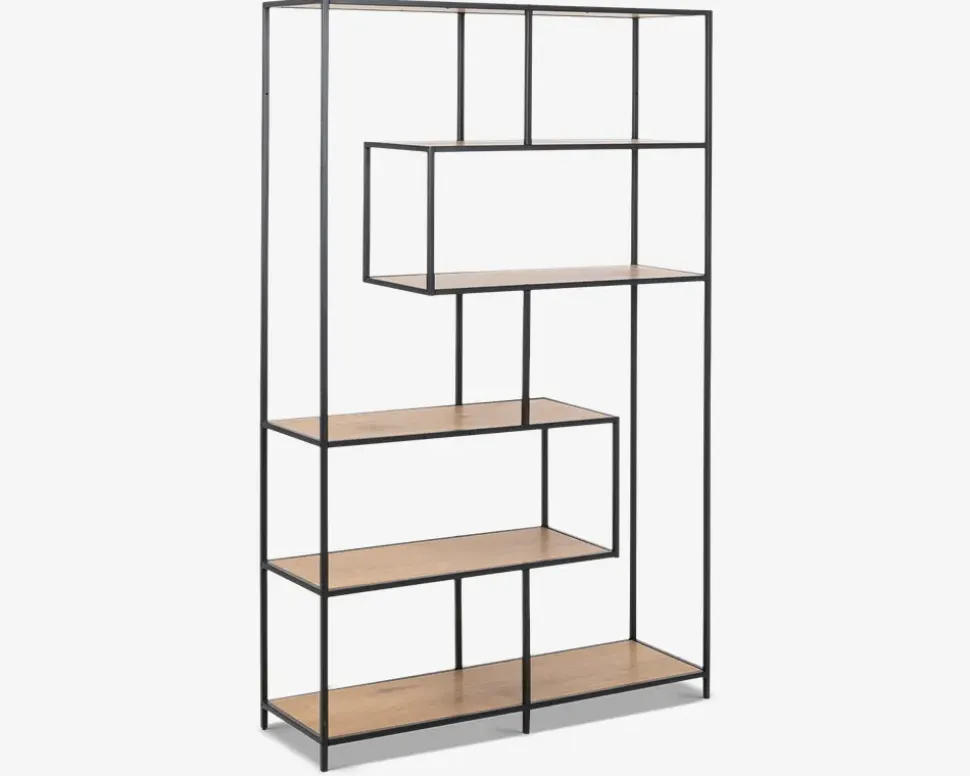 Fritstående reol i sort lakeret metal med hylder i vild eg farvet kunstfiner. Hylderne er placeret asymmetrisk, som i sig selv er meget skulpturelt. Det giver reolen en meget dekorativt udseende og giver et flot og anderledes look. Reolen kan selvfølgelig også stilles langs en væg.I denne serie kan der fås mange forskellige møbler, som gør det muligt at møblere de fleste rum i hjemmet med lige netop denne serie. Serien består af meget ”lette” møbler som kan give et enkelt og flot udtryk overalt i hjemmet. Flere typer sofaborde, tv-borde, reoler, serveringsvogne, skriveborde. Me denne serie er det nemt at indrette sig hyggeligt og praktisk på samme tid.• Fritstående reol.• Sortlakeret metalstel• Hylder i lys vild eg farvet kunstfiner• Dekorativt udseende• Leveres usamlet, men samles nemt• Mål i cm. B.114 x D.35 x H. 185 cm