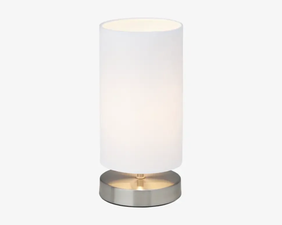 Fin og dekorativ lille Clarie bordlampe. Lampen giver et indirekte lys, og er derfor specielt velegnet på sengebordet, hvis ikke du læser i sengen, eller på reolen hvor du trænger til lidt lys, i den mørke sæson.• Mål i cm: H.25 x Ø.12 • Farve: Hvid/børstede stål• Materiale: Metal/Stof• Fatningstype: E14, maks. 40W• Ekskl. Lyskilde• IP20• Ledningslængde: 150 cm