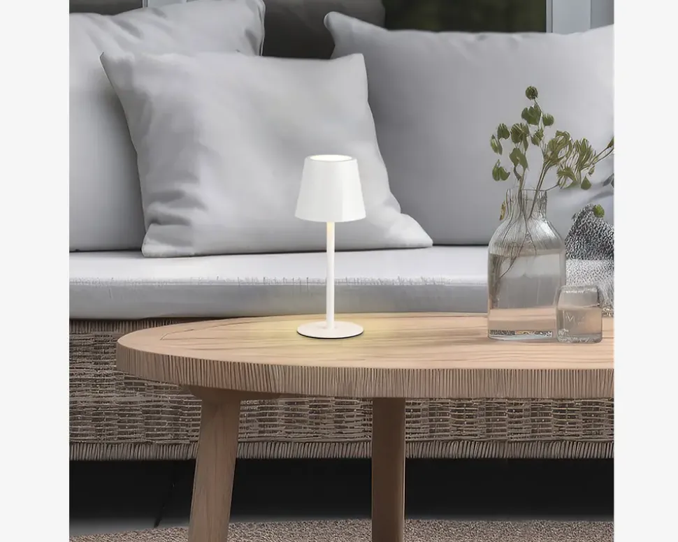 Diaz er en stilren bordlampe udført i metal med en højde på 21 cm og en diameter på 8 cm. Lampen har touch-funktion, så du nemt kan tænde, slukke og justere lyset med et enkelt tryk. Med IP44-klassificering er den derfor velegnet til både stuen og altanen eller som stemningslys i andre rum.