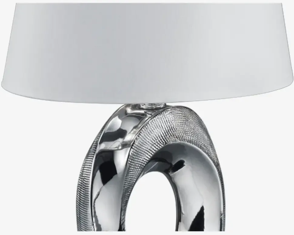 Her har du en moderne bordlampe, som med sit utraditionelle design er mere en pyntefigur end en lampe. Den sølvfarvede finish er med til at give bordlampen sit moderne udtryk, og den vil passe ind i indretningen i mange moderne hjem .• Mål i cm: H.33 x B.23 x D.16• Farve: sølv/hvid• Materiale: keramik/stof• Fatningstype: E14, maks. 40W• Ekskl. Lyskilde• IP20• Ledningslængde: 150 cm