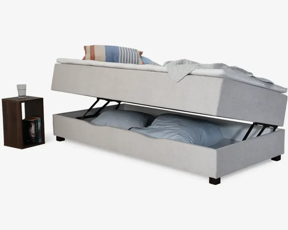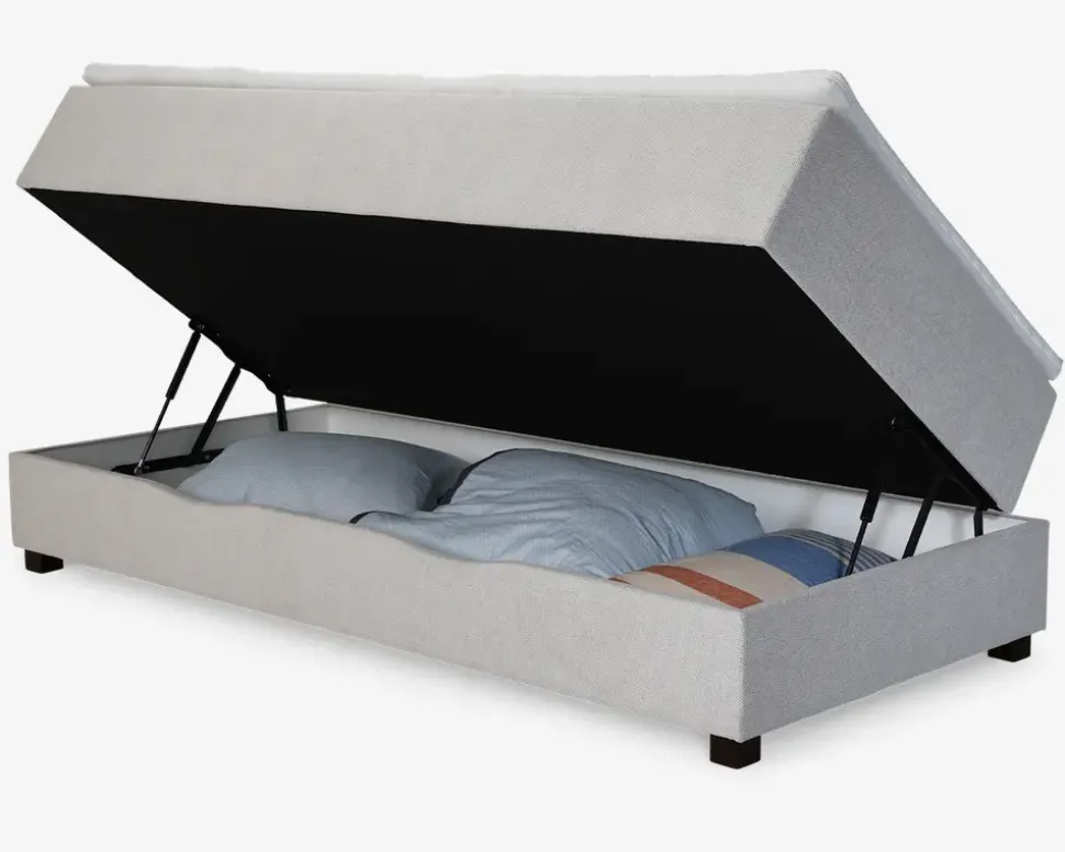 Denne boxmadras med magasin er beklædt med slidstærkt møbelstof i beige. Boxmadrassen er perfekt til både ungdomsværelset, studielejligheden og sommerhuset, den giver både en god soveplads, og masser af plads til opbevaring af ekstra dyner, tasker og lignende. Selve magasinet er monteret på en base fremstillet af lamineret spånplade, beklædt med slidstærkt møbelstof.Madrassen er monteret på basen med kraftige beslag, og løftefunktionen lettes af en gasfjeder som letter arbejdet med at åbne og lukke til magasinet. Bemærk de fine udskæringer i magasinet, som forhindre at du får fingrene i klemme, når du åbner og lukker.Selve madrassen består af et fjederindlæg bestående af 231 posefjedre pr. m². Posefjedre er individuelt indpakket, og giver derfor den bedst mulige støtte til din kroppen, igennem hele natten.Polstringen er en 25 kg. polyetherskum, som giver en behagelig komfort.Topmadrassen består af 30 mm profileret polyetherskum, beklædt med quiltet stof i 100% polyester. Betrækket på topmadrassen kan afmonteres og vaskes ved 40°.Denne boxmadras med magasin giver en ny mening til konceptet med at opbevarer ting under sengen, du har her mulighed for at opbevare dine ting, på en pæn og ryddelig måde.• Magasin base i lamineret spånplade• Boxmadras med 231 posefjedre pr. m².• Topmadras i profileret polyetherskum• Betræk på topmadras kan vaskes• Mål i cm.: H. 62 x B. 90 x L. 200• Sælges komplet inkl. ben og topmadras• Leveres samlet