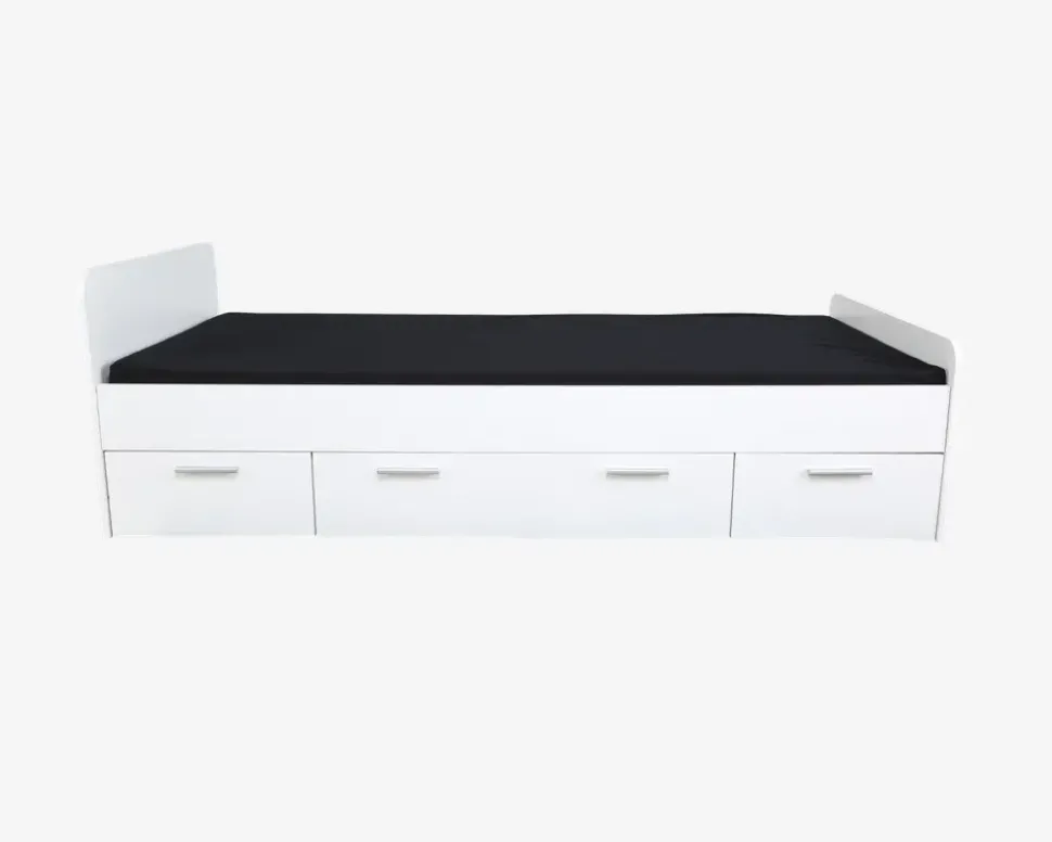 Smart briks i hvid melamin. Har mange skuffer som alle er på hjul, som gør at de nemt kan trækkes ud også selv om der er meget vægt i skufferne. Rigtig gode opbevaringsmuligheder. I den ene skuffe er en hylde ovenpå, så man kan bruge det som et lille sengebord. Briksen leveres uden bund og madras. Madras målet er 90×200 cmDette møbel er en del af en serie af børne og ungdomsmøbler. Med møblerne fra denne serie er det nemt at indrette et godt børne og ungdomsværelse. Men de kan også bruges for sig selv og i mange andre sammenhænge. Møblerne er fremstillet i melamin som er både slag og ridsefast og så er det meget rengøringsvenligt. Skal bare tørres af med en hårdt opvredet klud.• Hvid melaminbelagt spånplade• Ridse og slagfast. • Meget rengøringsvenligt• Madrasmål 90×200 cm• Leveres usamlet men samles let• Mål i cm. Udvendigt. L.204 x B.95 x H.65,5.• Bemærk briksen leveres uden bund og madras