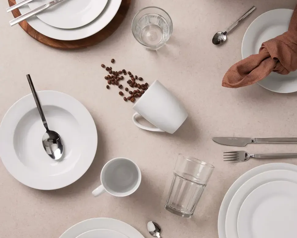 Aida Café-stellet er et klassisk og tidløst stel, der passer perfekt til både hverdag og særlige anledninger. Med sit enkle og stilrene design kan det nemt kombineres med andre stel eller stå flot alene. Stellet er lavet i porcelæn og tåler både opvaskemaskine og mikroovn. Aida Café er det ideelle valg for dig, der ønsker et stilrent udtryk ved borddækningen uden at gå på kompromis med kvalitet og anvendelighed.