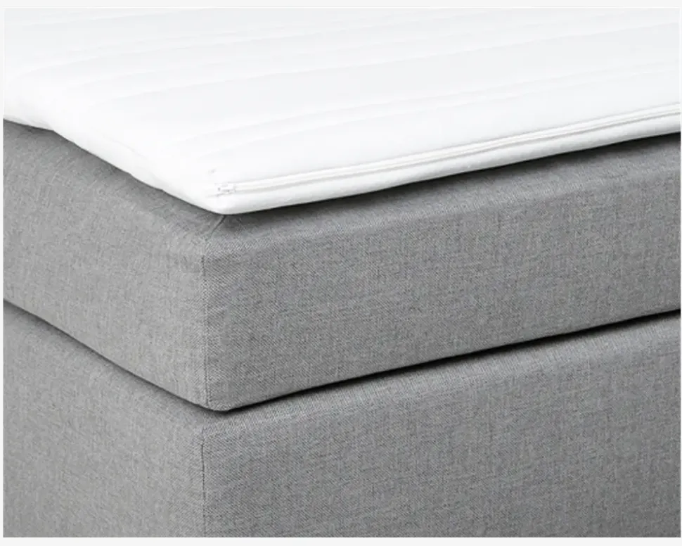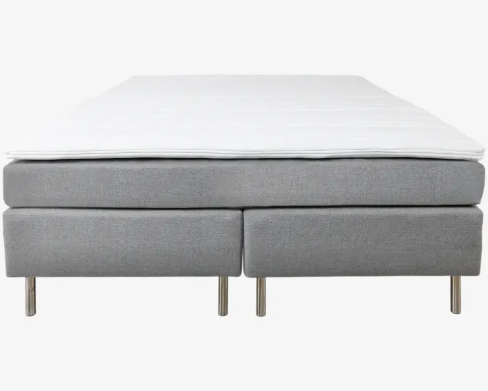 Her har du en flot continentalseng i 180 x 200 cm inkl. ben og topmadras. Sengen består af 2 sæt ben i krom, 2 baser med et springindlæg med 105 bonell fjedre pr. m², 2 stk. 5-zonet springmadrasser med 250 posefjedre pr. m², til springmadrasserne medfølger et stort betræk, således at madrassen giver følelsen af en stor madras. Endelig medfølger også en stor topmadras i polyetherskum. Basen med bonell fjedrene giver en god og fast base til continentalsengen, og de 105 fjedre pr. m² giver en holdbar seng, og er sammen med springmadrassen med til at sikre dig en god nattesøvn. De 250 posefjedre pr. m² giver din krop god mulighed for at hvile og slappe af, og den god understøttelse er med til at give dig en mere rolig og dybere søvn. Det løse betræk til springmadrasserne og betrækket på basen er det samme slidstærke møbelstof, og den grå nuance giver et frisk pust til indretningen.Denne Continentalseng kræver kun ganske lidt vedligeholdelse, sengen rengøres med en støvsuger, og betrækket på topmadrassen kan afmonteres og vaskes i vaskemaskinen ved 30°. Selve springmadrasserne som ligger inde i det løse betræk, bør vendes 1- gange om året, det gøres dels for at bevare formen bedst muligt, men også for at forlænge levetiden på madrassen. Hvis du vælger at vaske det aftagelig betræk, bør du monterer det igen mens det stadig er fugtigt, så det har mulighed for at strække sig igen.• Komplet continentalseng• Ink. ben, baser, springmadrasser, betræk og topmadras• Medium hårdhed• Sælges kun komplet• Der kan tilkøbes gavl i samme betræk• Mål i cm: H.70 x B.180 x L.200• Leveres usamlet