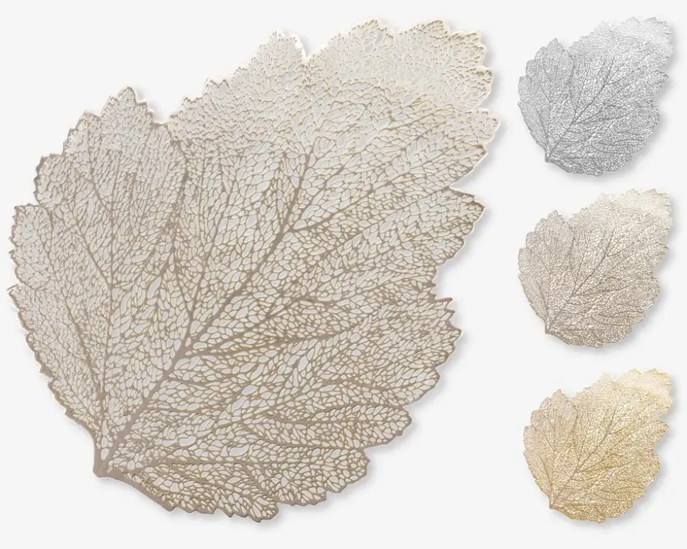 Funktionel dækkeserviet som måler 46×35 cm. Den er formet som et blad og kommer med et fint mønster. Placer denne dækkeserviet under tallerkener, glas eller karafler for at beskytte dit bord. Bemærk at de kommer assorteret, købes enkeltvis og at der ikke kan vælges farve ved køb i webshoppen.