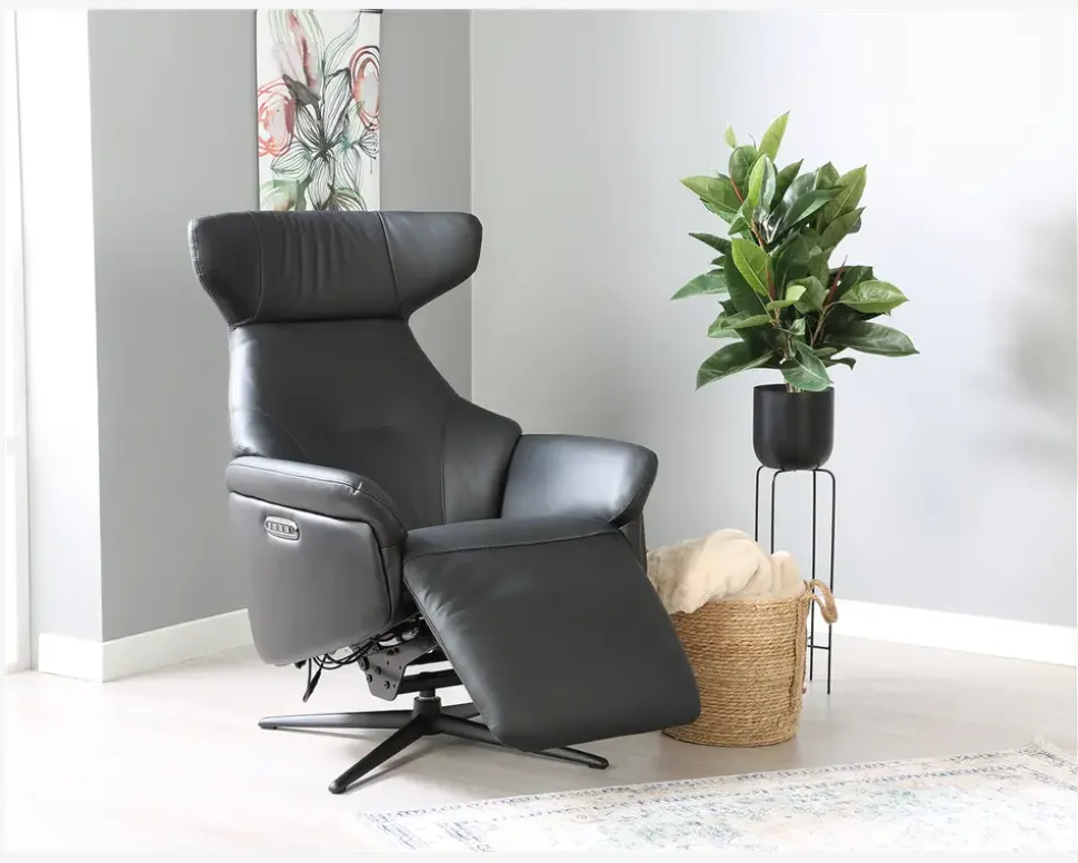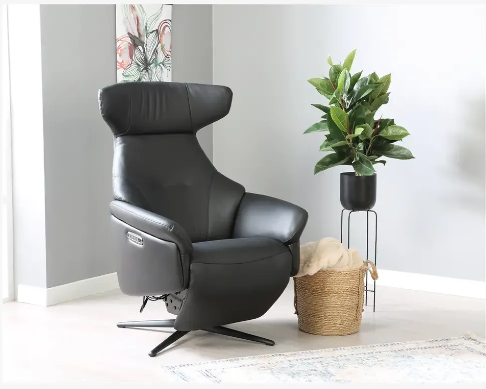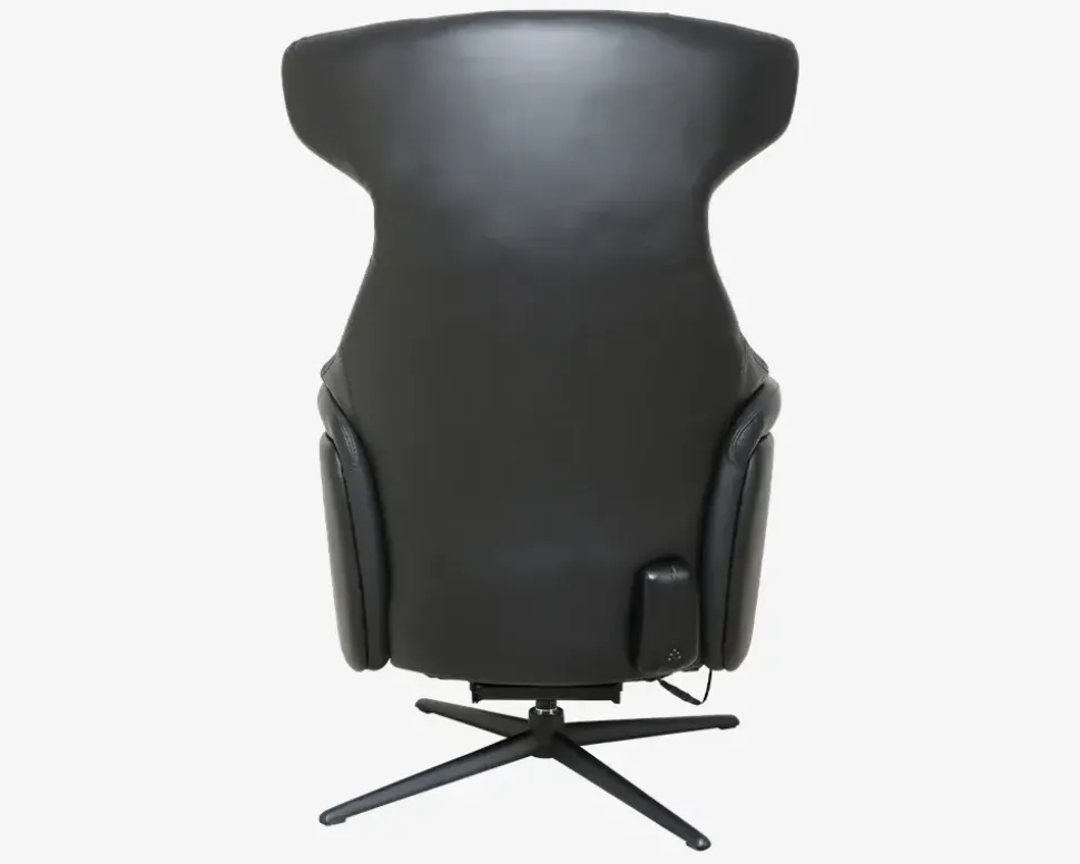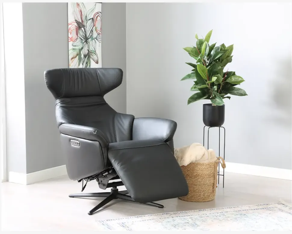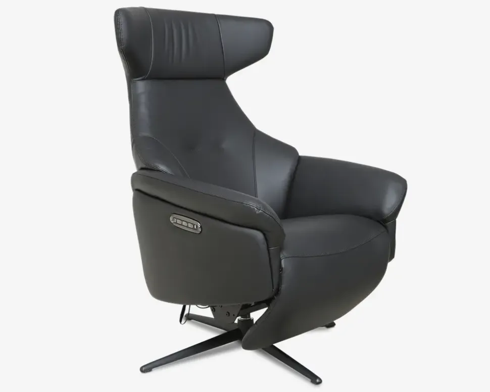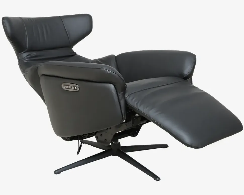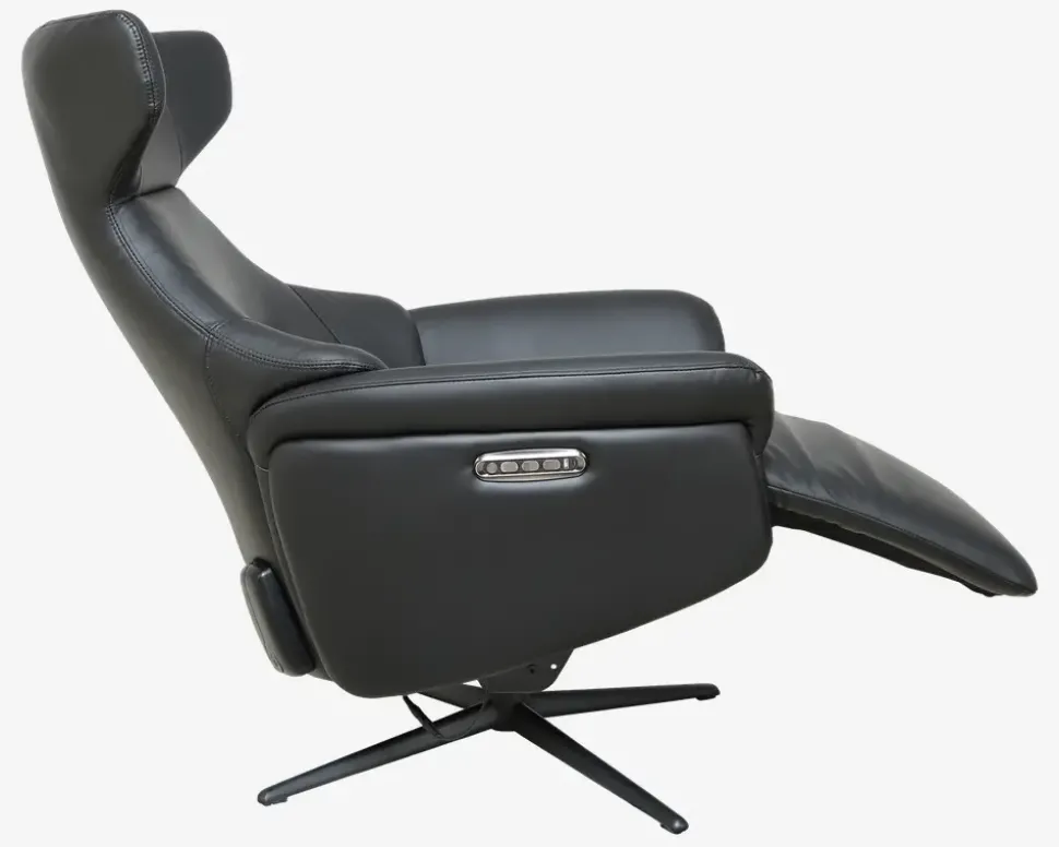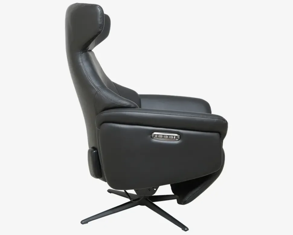 Super lækker drejestol i et flot design og en fantastisk kvalitet. Stolen har fuldautomatisk eldrevet motormekanisme og er med batteri. dette betyder at stolen kan lades op og kan køre uden ledning tilsluttet. Stolen her har et batteri der kan afmonteres, hvilket betyder at du aldrig skal have ledningen tilsluttet stolen, men kan lade batteriet op hvor det nu er mest hensigtsmæssigt. Derfor kan denne stol stå helt frit i stuen uden ledning man kan falde over. Efter en fuld opladning kan den holde strøm i ca. 15-20 dage, alt efter hvor meget den bliver brugt. Stolen er med indbygget fodskammel hvilket er meget pladsbesparende, da skamlen ikke står i vejen hele tiden, når man ikke har brug for den. Stolen her er inklusiv 3 motorer, 1 til rygregulering, 1 til indstilling af fodskamlen og 1 til regulering af nakkestøtten. Alt dette reguleres med betjeningen som sidder på siden af stolen. I betjeningen er der også USB stik og C-stik, så man kan oplade sin mobil og andre enheder mens man sidder i stolen. Stolen er monteret med sort okselæder på alle slidflader og har en flot sort lakeret metalfod. Stolen har formstøbt koldskum i sædet, hvilket giver en fantastisk siddekomfort og en meget lang holdbarhed.• Inkl. indbygget fodskammel• Dreje og vippefunktion• Elektrisk, fuldautomatisk motormekanisme• Lækkert sort okselæder på alle slidflader• Fantastisk siddekomfort• Regulerbar nakkestøtte• Sortlakeret metalfod• Mål i cm: B.75 x D.85 x H.46/114