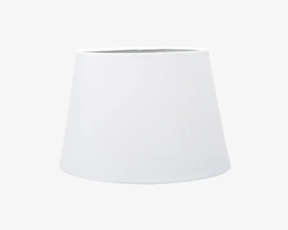 Enkel og klassisk hvid oval lampeskærm i bomuld som passer i ethvert hjem, da farven og skærmen er neutral. Lampeskærmen er særligt velegnet til en lampefod som kan købes fra sortiment. Lampeskærmen sættes på ved at to metalbøjler inde i lampeskærmen klikkes ned over pæren.