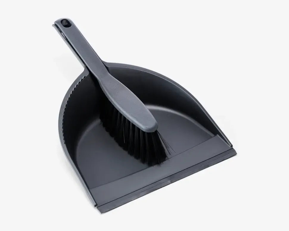 Klassisk fejebakkesæt i sort plastik. Fejebakken er udstyret med en gummikant, der gør det lettere at få skidtet fejet op på bladet. Fejebakken er praktisk og fylder ikke meget, da kosten kan klikkes fast i fejebakkens håndtag for nem opbevaring, når sættet ikke er i brug.