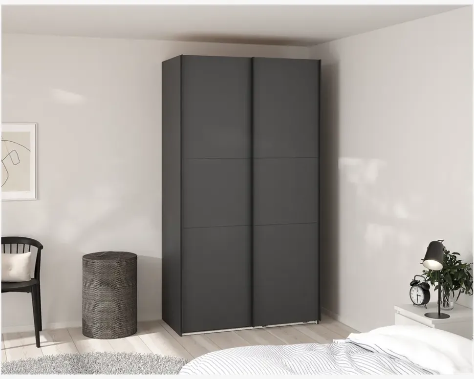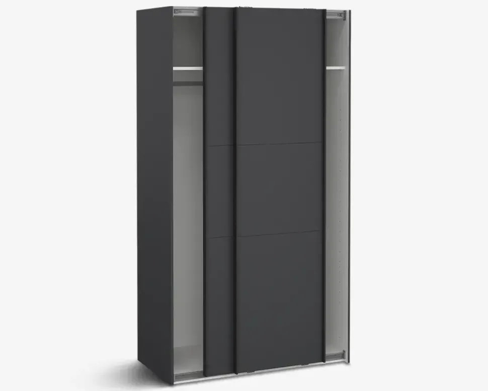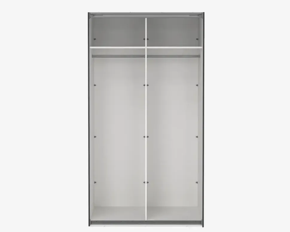 Her for du et virkelig rummeligt garderobeskab, som findes i flere bredder, så det er nemt at kombinerer, hvis du ønsker et stor garderobeskab, eller blot ønsker den samme type skab i hele huset. Dette garderobeskab måler H. 221 x B. 119 x D. 67 cm. Det indeholder to rum, i hvert af disse er der en fast hylde, samt en bøjlestang. De to skydelåger, glider nemt og sikre en eksklusiv følelse når du åbner og lukker skabet.Der kan tilkøbes både ekstra hylder, skuffeindsatser, samt dørdæmpere, som vil øge den eksklusive følelse yderligere, når du åbner og lukke skabet. hvis du ønsker det kan den ene eller begge låger udskiftes til spejllåger, så kort sagt et skabsserie med mange muligheder.Skabsserien udmærker sig ved at den monteres oprejst, det giver bedre mulighed for at udnytte den totale lofthøjde i rummet, ligesom den kan samles på stedet, og ikke efterfølgende skal skubbes på plads, med risiko for skader på både møbel og gulvbelægning. Vi anbefaler at I er 2 når skabet skal samles. Garderobeskabet kræver ingen vedligeholdelse, og rengøringen foretages med en klud vredet op i rent vand.