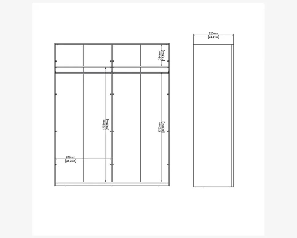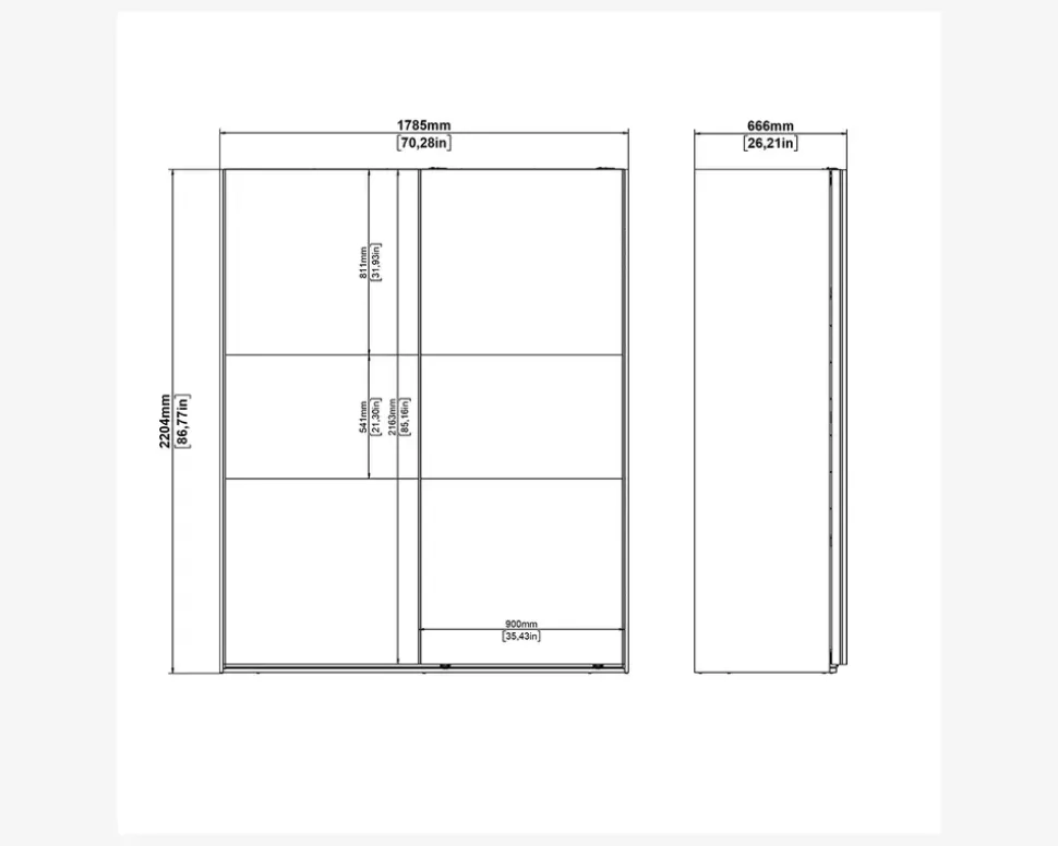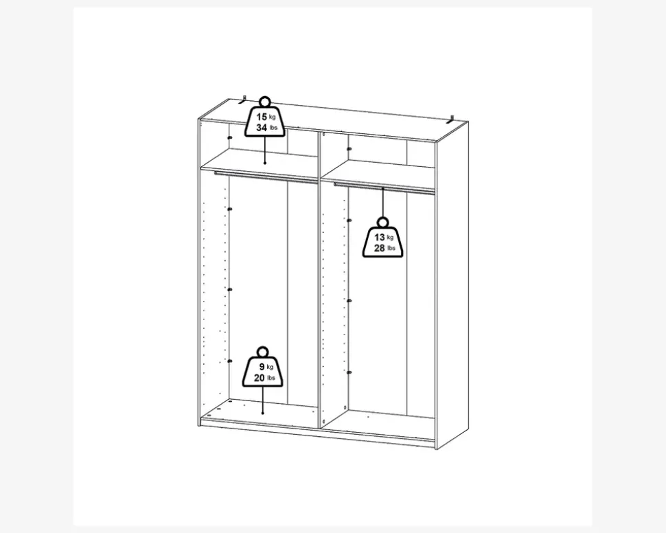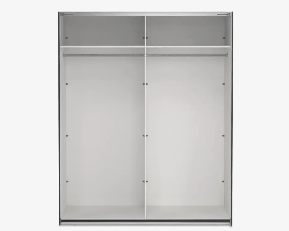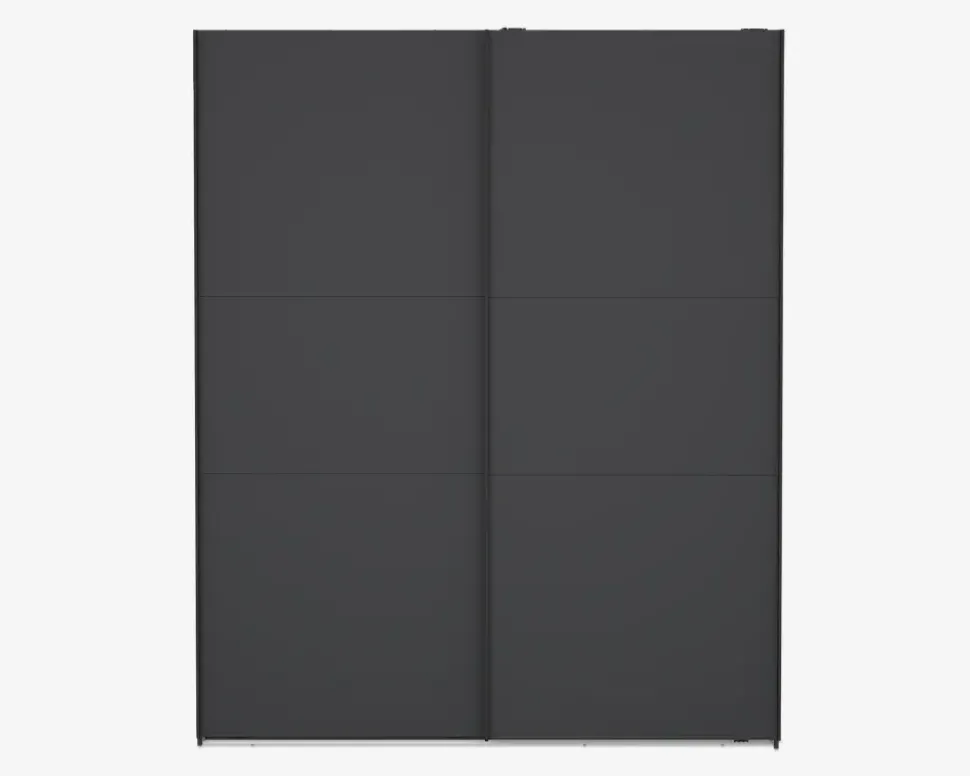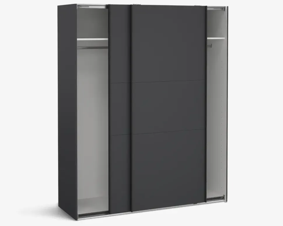 Her for du et virkelig rummeligt garderobeskab, som findes i flere bredder, så det er nemt at kombinerer, hvis du ønsker et stor garderobeskab, eller blot ønsker den samme type skab i hele huset. Dette garderobeskab måler H. 221 x B. 179 x D. 67 cm. Det indeholder to rum, i hvert af disse er der en fast hylde, samt en bøjlestang. De to skydelåger, glider nemt og sikre en eksklusiv følelse når du åbner og lukker skabet.Der kan tilkøbes både ekstra hylder, skuffeindsatser, samt dørdæmpere, som vil øge den eksklusive følelse yderligere, når du åbner og lukke skabet. hvis du ønsker det kan den ene eller begge låger udskiftes til spejllåger, så kort sagt et skabsserie med mange muligheder.Skabsserien udmærker sig ved at den monteres oprejst, det giver bedre mulighed for at udnytte den totale lofthøjde i rummet, ligesom den kan samles på stedet, og ikke efterfølgende skal skubbes på plads, med risiko for skader på både møbel og gulvbelægning. Vi anbefaler at I er 2 når skabet skal samles. Garderobeskabet kræver ingen vedligeholdelse, og rengøringen foretages med en klud vredet op i rent vand.