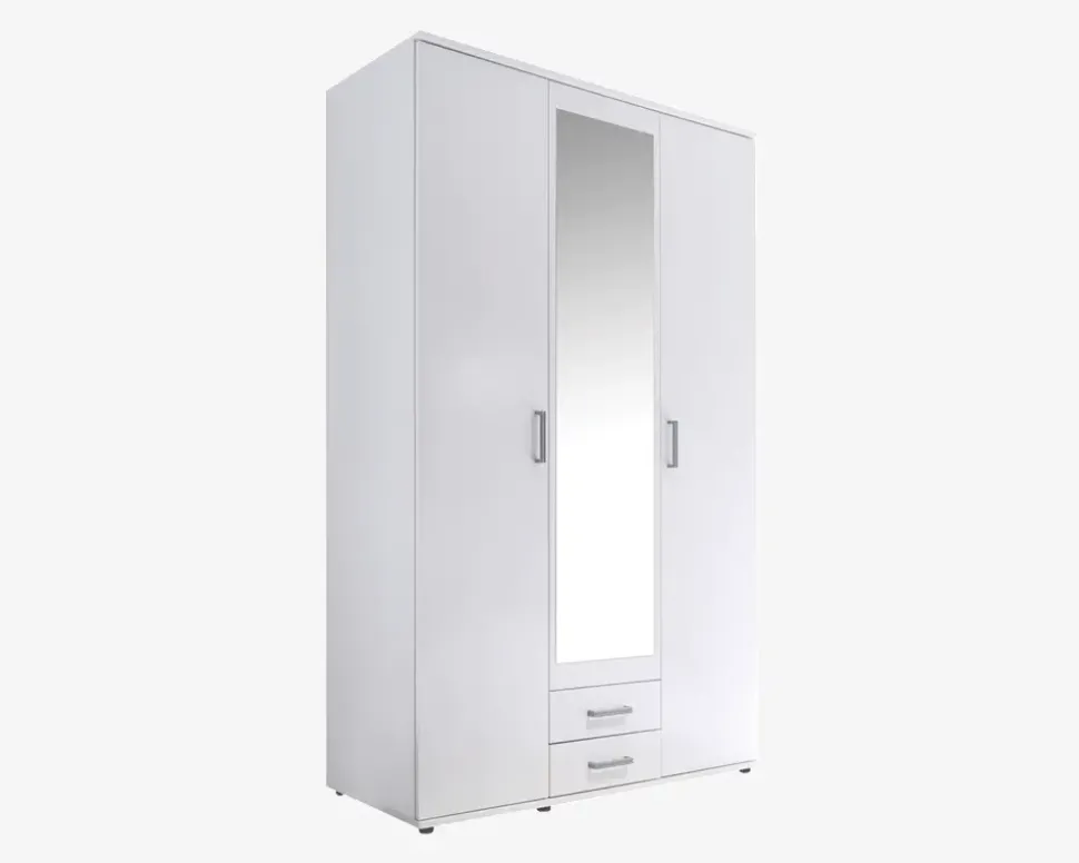 Garderobeskab som er perfekt til den lille lejlighed, børne- eller gæsteværelset. Skabet er fremstillet i hvid kunstfiner, og leveres med to skuffer, to trædøre samt en spejldør. Garderobeskabet måler B.120 x H.195 x D.51 cm, og leveres usamlet. Garderobeskabet samles uden problemer, hvis du følger den vedlagte samlevejledning. Vi anbefaler altid at I er 2 om at samle skabet, så I undgår skader, både på produktet og på jer selv under samlingen. Vi anbefaler ligeledes at skabet fastmonteres i væggen, det vil både gøre skabet stabilt, og samtidig være en forebyggelse mod at skabet vælter, hvis der bliver kravlet op på skabets hylder.Skabet er færdigindrettet, og der kan ikke tilkøbes yderligere hylder. Bag de to døre til højre indeholder skabet en hylde samt en bøjlestang, og bag døren til venstre er skabet udstyret med 3 hylder, som kan justeres lidt i højden. Skabet giver med sin indretning plads både til bøjletøj kort og langt, tøj som du gerne vil have i skuffe, og endelig tøj som du ønsker at opbevare på hylder.• 4 hylder• 1 Bøjlestang• Mål i cm: H.195 x B.120 x D.51• Findes også i eg kunstfiner• Leveres usamlet