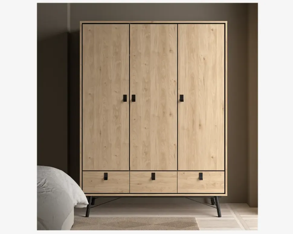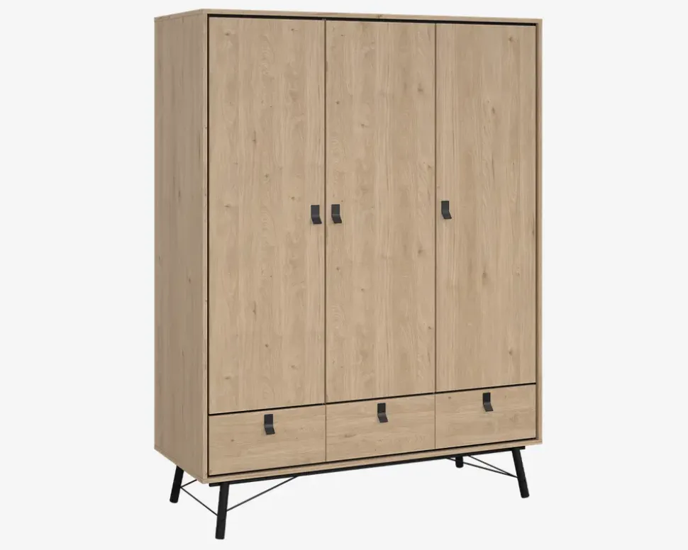Ry er en serie af møbler som er fremstillet til spisestuen og soveværelset. Serien er fremstillet i et moderne design, som kan kombineres med en lang række af vores spiseborde og senge. Serien findes i 2 forskellige farvekombinationer sort/valnød eller i eg/sort. De forskellige møbler er fremstillet i kunstfiner, som dels ikke kræver nogen vedligeholdelse, og samtidig er utrolig rengøringsvenlige. Alt du skal gøre er at vride en klud op i rent vand, og tørre møblet af. Skulle du opleve at du står overfor lidt mere genstridige mærker, kan disse fjerne med en smule husholdningssprit på en klud. Serien leveres usamlet, men hvis du blot holder dig til den medfølgende samlevejledning er møblet enkelt at samle. Du bør sætte lidt tid af, da der er mange løsdele. Når møblet skal vendes eller flyttes anbefaler vi altid at I er 2.Dette garderobeskab i eg kunstfiner indeholder 3 skuffer og 3 låger. Bag de 2 af lågerne er der et dobbelt rum som indeholder en bred hylde samt en bøjlestang, bag den sidste låge medfølger der 3 hylder. Garderobeskabet er velegnet til både soveværelset og børneværelset, da du får god opbevaringsplads, og masser af muligheder for at holde orden i garderoben.• Rengøringsvenlig• Findes også som kommode og sengebord• Mål i cm.: 200,4 x 150,2 x 60,1• Leveres usamlet