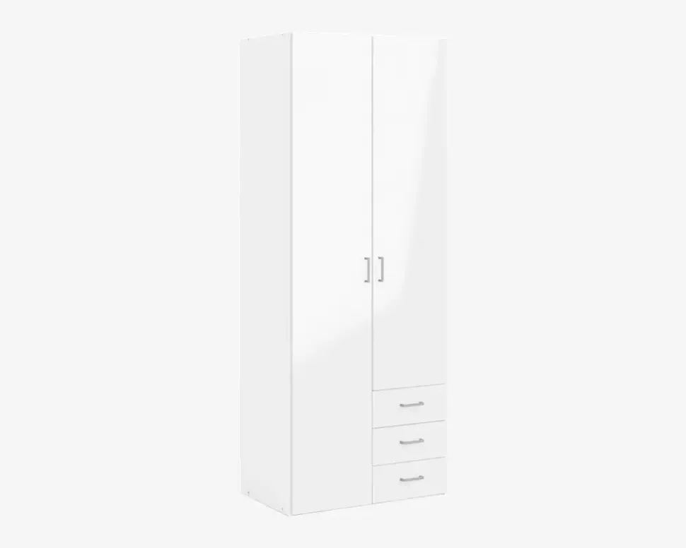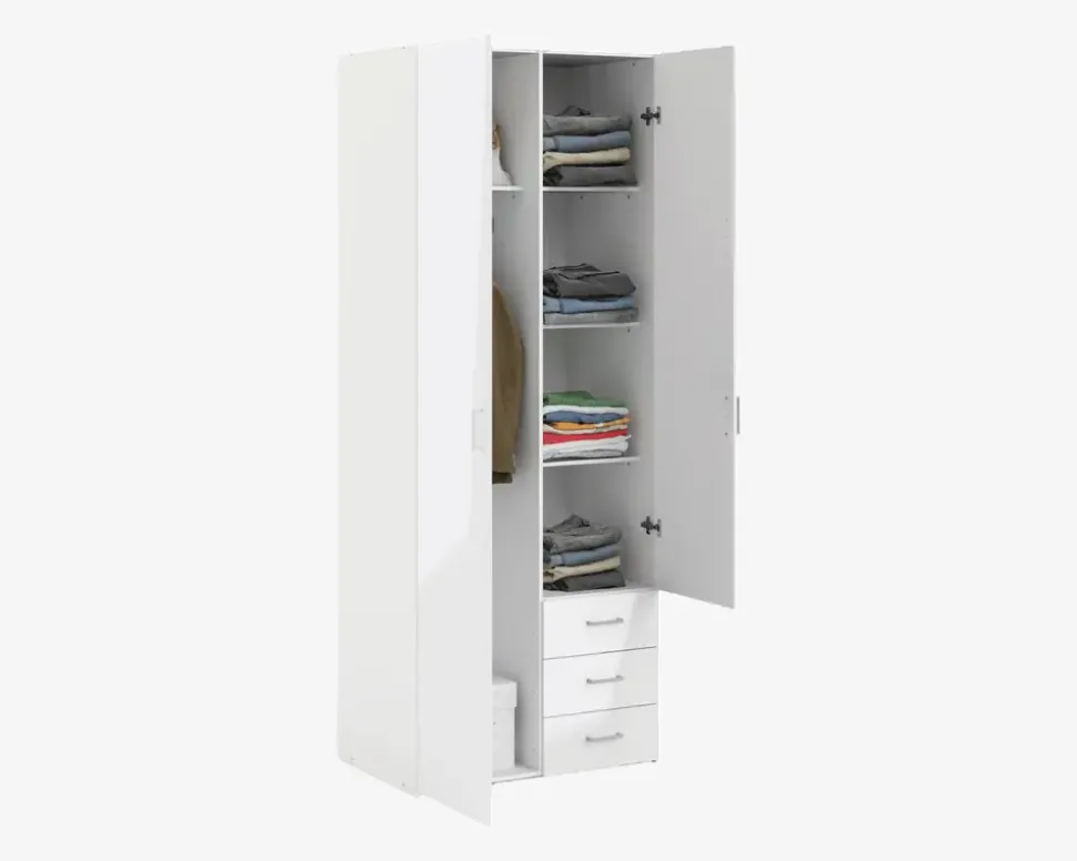 Space er en serie af garderobeskabe som findes i 3 størrelser. Space udmærker sig ved at være en serie af skabe i en fornuftig kvalitet, til en super god pris. Skabene leveres komplet med indretning, og der kan ikke tilkøbes ekstra hylder til skabene. Garderobeskabe er fremstillet i hvid kunstfiner med front i hvid højglans kunstfiner.Dette space skab er særligt velegnet til børne eller ungdomsværelset, men også i den lille lejlighed alle sommerhuset, hvor behovet for opbevaring af tøj er mindre. Skabet her måler 77,6 cm i bredden, og indeholder 2 rum som begge er 37 cm i bredden, i den ene side har du 3 skuffer, og bag lågen over skufferne er der som standard 3 hylder. Du bestemmer selv om du ønsker skufferne til højre eller venstre, du er dog nødt til at tage beslutningen før du samler skabet, da det ikke er muligt at ændre efterfølgende. I den høje del af skabet har du en hylde samt en bøjlestang, og det er ikke muligt at tilkøbe ekstra hylder. Skabet kan kombineres med de øvrige skabe i serien, hvis du har behov for mere skabsplads.• Produceret i Danmark• 4 hylder, 3 skuffer og 1 bøjlestang• Mål i cm: H.200,4 x B.77,6 x D.49,8• Leveres usamlet