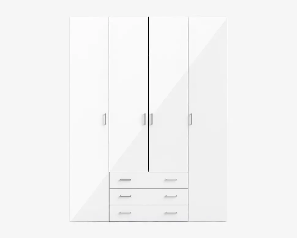 Space er en serie af garderobeskabe som findes i 3 størrelser. Space udmærker sig ved at være en serie af skabe i en fornuftig kvalitet, til en super god pris. Skabene leveres komplet med indretning, og der kan ikke tilkøbes ekstra hylder til skabene. Garderobeskabet er fremstillet med korpus i hvid kunstfiner, og front i hvid højglans kunstfiner.Dette space skab er giver god plads til opbevaring af alt dit tøj. Skabet her måler 154 cm i bredden og indeholder 3 rum, 1 rum som er 74 cm i indvendig bredde indholdende 3 skuffer, 1 hylde og 1 bøjlestang, samt 2 rum som er 37 cm i bredden og begge indeholde 4 hylder. Skabet giver således ikke plads til de lange selskabs kjoler, men ellers har du gode muligheder for at opbevarer hele garderoben. Det er ikke muligt at tilkøbe ekstra hylder, og skufferne skal sidde i midten af skabet. Skabet kan kombineres med de øvrige skabe i serien, hvis du har behov for mere skabsplads.• Produceret i Danmark• 9 hylder, 3 skuffer og 1 bøjlestang• Mål i cm.: H.200,4 x B.154 x D.49,8• Leveres usamlet
