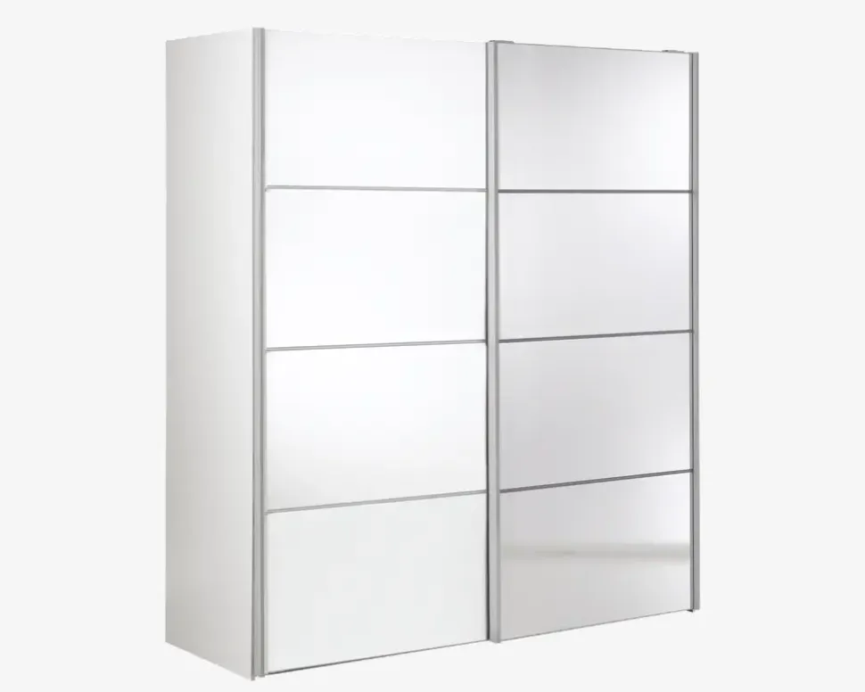 Verona er en serie af garderobeskabe som er 201,54 cm. høje. Serien består af skabe i 3 forskellige bredder, som findes med låger i flere farver. Verona garderobeskabene har som standard indretning 1 hylde samt 1 bøjlestang i hvert rum.Dette Verona garderobeskab måler H.201,54 x B.182,4 x D.64 cm, og har 2 skydedører som hver består af 4 paneller. Skabet er opdelt i 2 lige store rum som måler 90 cm i bredden, og begge indeholder 1 hylde samt en bøjlestang. Skabet er velegnet med standard indretningen, hvis du har meget tøj der skal hænge på bøjler. Hvis du ønsker kan der tilkøbes ekstra hylder som naturligvis kan placeres i den side du ønsker. Ekstra hylderne sælges i pakker af 3 stk. og er inklusiv hyldebærer. Du har også mulighed for at tilkøbe en skuffesektion med 3 skuffer, her skal du være opmærksom på at skuffesektionen ikke fylder hele rummet, hvis den gjorde ville skufferne ikke kunne åbnes, på grund af skydelågerne. Endelig har du også mulighed for at tilkøbe dørdæmpersæt, så døren lukkes langsomt og eksklusivt.Vi lagerfører dette skab i 4 udgaver som vist her i hvid/spejl, men også i henholdsvis hvid/hvid, spejl/spejl og eg/spejl, vi kan derfor altid tilbyde hurtig levering af disse 4 udgaver. Derudover kan vi tilbyde hurtig levering af skabet i andre størrelser i forskellige farvekombinationer, du finder alle de lagerførte variationer her på vores hjemmeside.• 2 hylder og 2 bøjlestænger• Fås i andre størrelser og farver• Mål i cm: H.201,54 x B.182,4 x D.64• 3 stk. ekstra hylder kan tilkøbes: Varenr. 58178• Skuffeindsats m/ 3 skuffer kan tilkøbes: Varenr. 80263• Leveres usamlet
