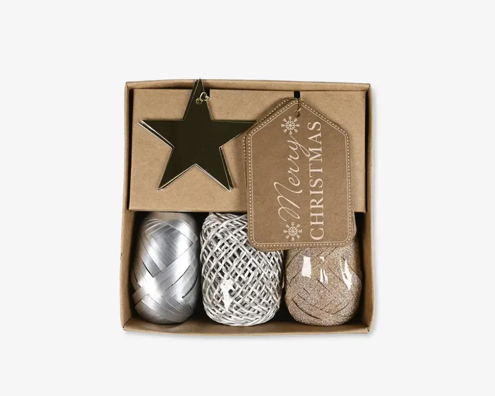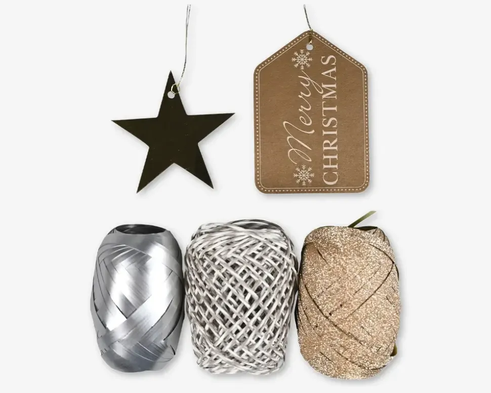 Gør dine gaver ekstra specielle med dette flotte gaveindpakningssæt. Sættet indeholder det du har brug for at skabe smukke og elegante gaveindpakninger, herunder glitrende bånd, skinnende stjerner, og flotte gavemærker. En smuk kombination af brune og sølv nuancer, perfekt til henover julen. Den praktiske opbevaringsæske gør det nemt at holde styr på alle dele og sikrer, at du altid har det rigtige til at gøre dine gaver uforglemmelige.Pakken indeholder 3 ruller gavebånd i forskellige farver og design samt 6 gavemærker i forskellige designs.