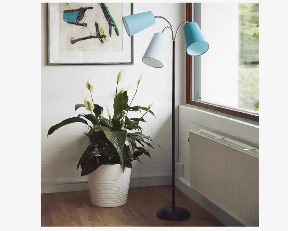 Salsa gulvlampe med sort stel og 3 skærme i lyseblå, aqua og petroleum. Lampen er udstyret med afbryder på ledningen samt fleksible kromarme til retningsbestemt belysning efter behov.Salsa gulvlampen findes i flere varianter.• Mål i cm: H.140 x Ø.24• Farve: Sort/Lyseblå/Aqua/Petroleum• Materiale: Metal/Tekstil• Fatning: E14, maks. 3 x 40W• Ekskl. Lyskilde• IP20• Ledningslængde: 190cm