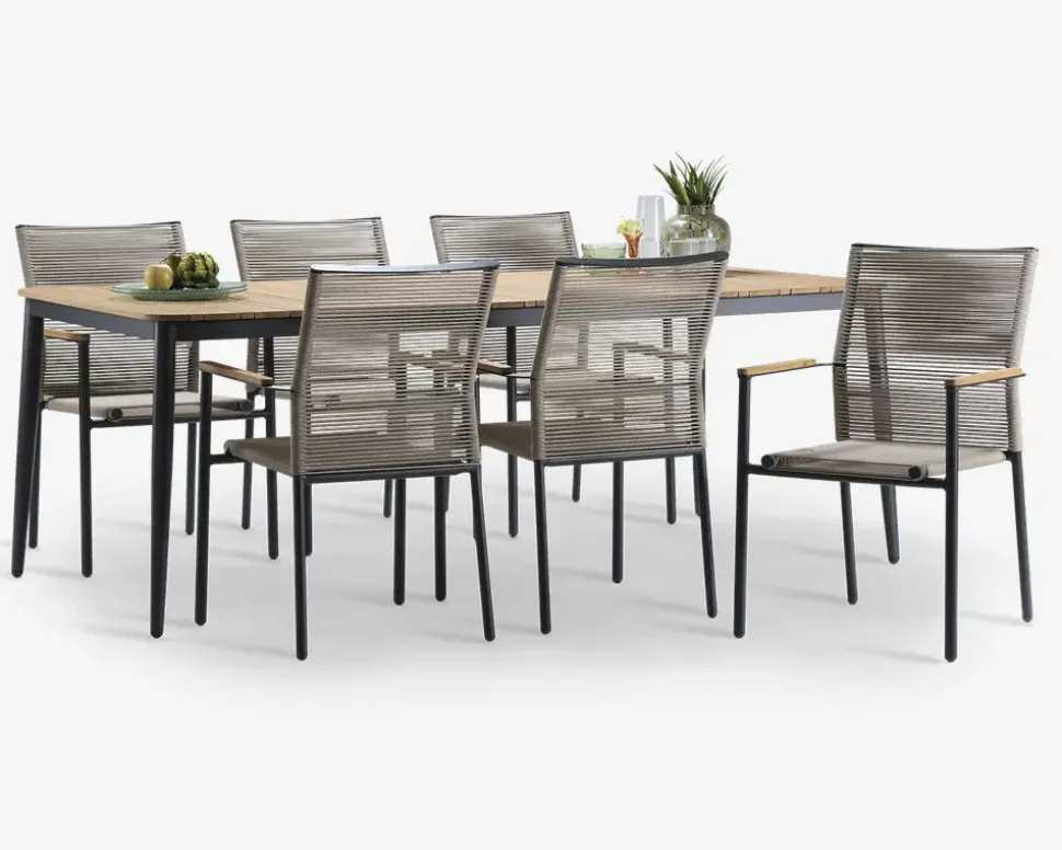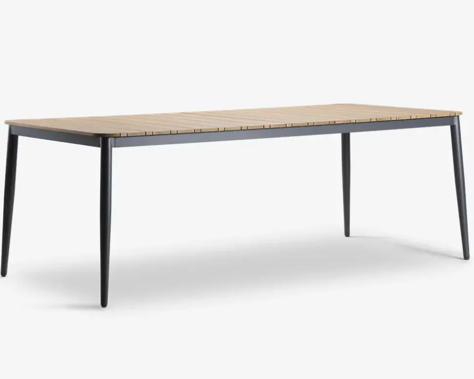 At spise ved et rektangulært havebord er helt perfekt, man kan se hinanden i øjnene, og man har en makker ved siden af man kan snakke med og få mange nogle hyggelige middage med en god bøf og lidt vin. Dette dejlige bord giver masser af plads til 8-10 personer, det kan ikke udvides. Bordet er fremstillet af et stel i antracit lakeret aluminium, og en bordplade bestående af lameller i massiv teaktræ som er lagt i et flot mønster. Bordet fås i 3 størrelser. Her er bordet vist i 100×210 cm.Man kan behandle borde i teaktræ med olie for at beholde den mørke glød i farven. Og det vil helt sikkert forlænge levetiden. Vi anbefaler at havebordet opbevares overdækket, tørt og frostfrit uden for sæsonen, da dette vil forlænge levetiden betragteligt. Eg god ide er at give bordet en omgang olie når det tages frem efter vinteren.• Nem at samle• Massiv bordplade i teak• Stel i aluminium• Mål i cm: H.75 x B.100 x L.210• Bør opbevares overdækket, tørt og frostfrit uden for sæsonen