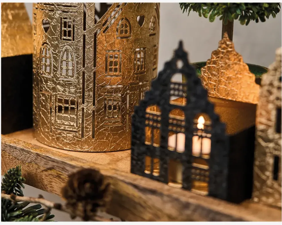 Dekorationshus til fyrfadslys i metal. Når lyset tændes, strømmer det blødt ud gennem husets små vinduer og skaber en hyggelig stemning. Perfekt at placere i vindueskarmen eller på en hylde.