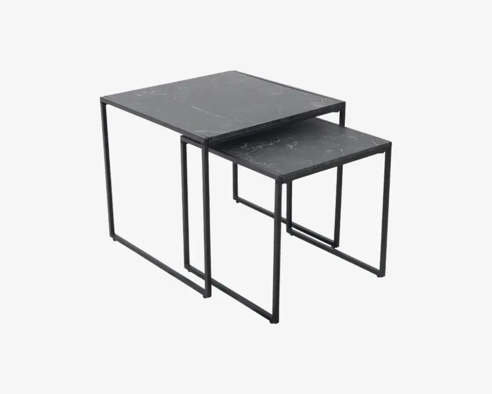 Flotte og moderne indskudsborde med en melamin overflade i marmor print, så man faktisk ikke kan se forskel. Melamin overfladen giver disse borde en utrolig stærk overflade. Slag og ridsefast og så kræver det ingen vedligeholdelse af bordpladen. I hverdagen er det nok at aftørre med en hård opvredet klud. Bordene har et sort lakeret metalstel. Sofabordet leveres usamlet, men samles nemt • Flotte og moderne indskudsborde• Melamin overflade i marmor print• Sortlakeret metalstel• Leveres usamlet, men samles nemt• Mål i cm. L.50 x B.50 x H.45 (Det store bord)