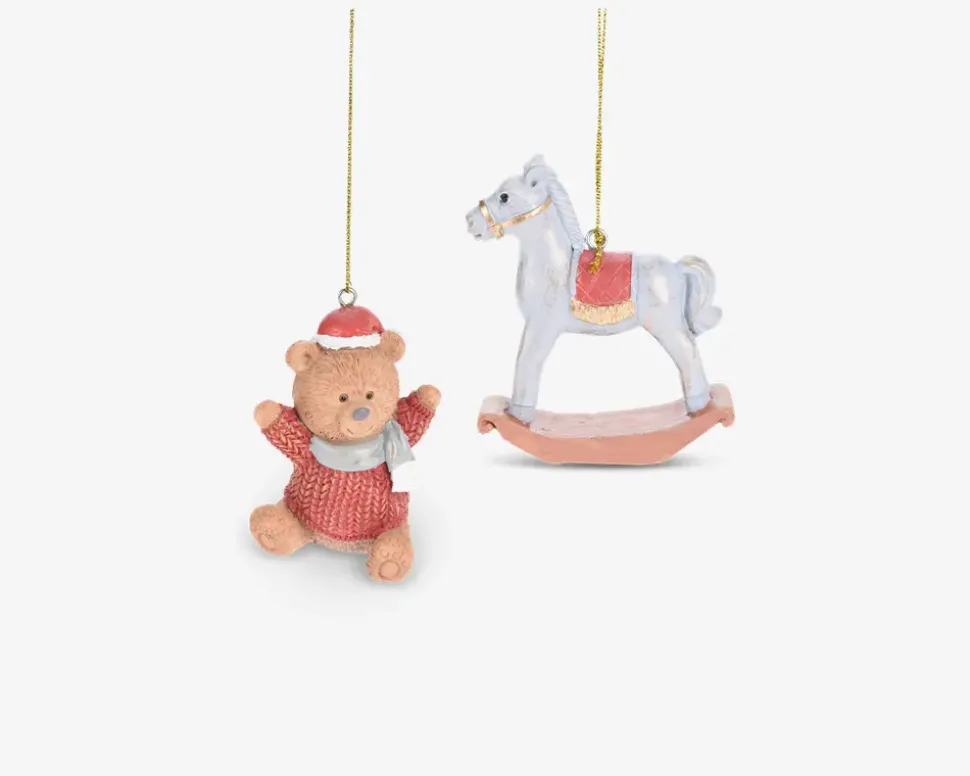 Juletræsophæng med gyngehest eller bjørn i lyse farver med flotte detaljer.Brug denne fine gyngehest og bjørn med ophæng som pynt på juletræet for et hyggeligt og nostalgisk stemning, der leder tankerne tilbage på den gammeldags jul og sjov for de små.