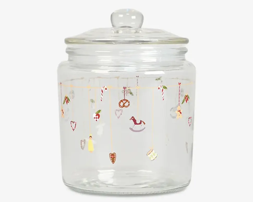 Dekorativ julekrukke i glas med en højde på 16 cm og diameter på 12 cm. Perfekt til opbevaring af småkager, juleslik eller andre lækkerier i juletiden. Krukken kombinerer funktion og hygge og passer fint på køkkenbordet, i reolen eller som del af en juleopstilling.