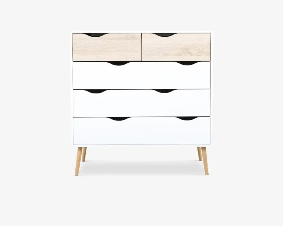 Denne flotte kommode i eg/hvid kunstfiner giver masser af plads til opbevaring af jeres tøj. Det lette skandinaviske design, vil passe flot ind i mange hjem. Materialerne sikre dig et møbel, som er nemt at rengøre og vedligeholde. Kunstfiner tåler alle former for rengøringsmidler, undtaget rengøringsmidler med slibemidler i.Kommoden har har 5 skuffer, 3 brede og 2 smalle, de mange skuffer hjælper dig til at lave dit eget system og sortering af dit tøj. Skufferne kører let på kuglelejer, også selvom skuffen er fyldt. Kommoden er nem at samle, og du vil opleve en kvalitet som du kan have glæde af i mange år fremover.• Let og elegant design• Rengøringsvenlige materialer• Mål i cm.: H.101 x B.99 x D.39 • Leveres usamlet, men samles nemt