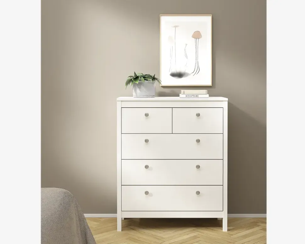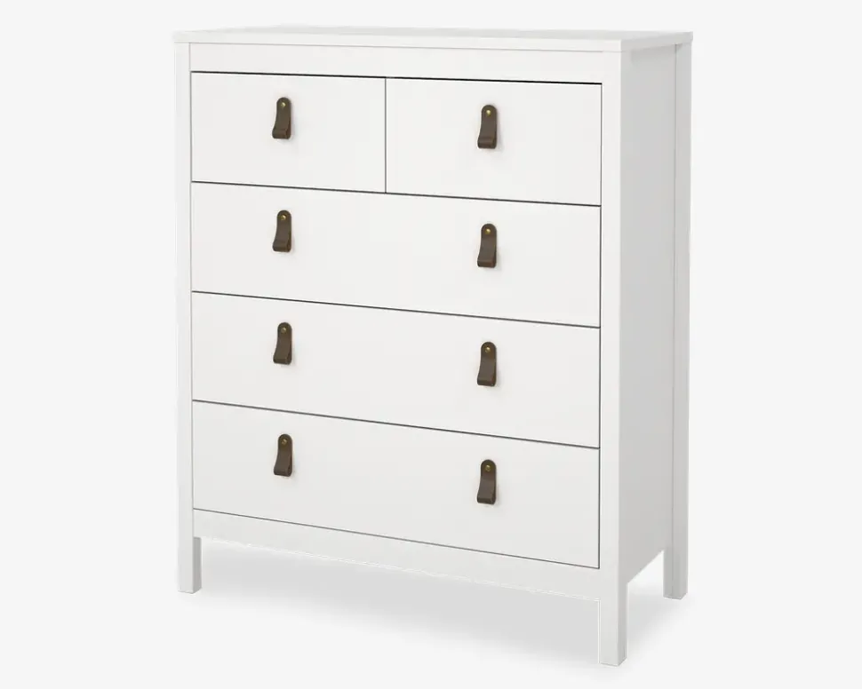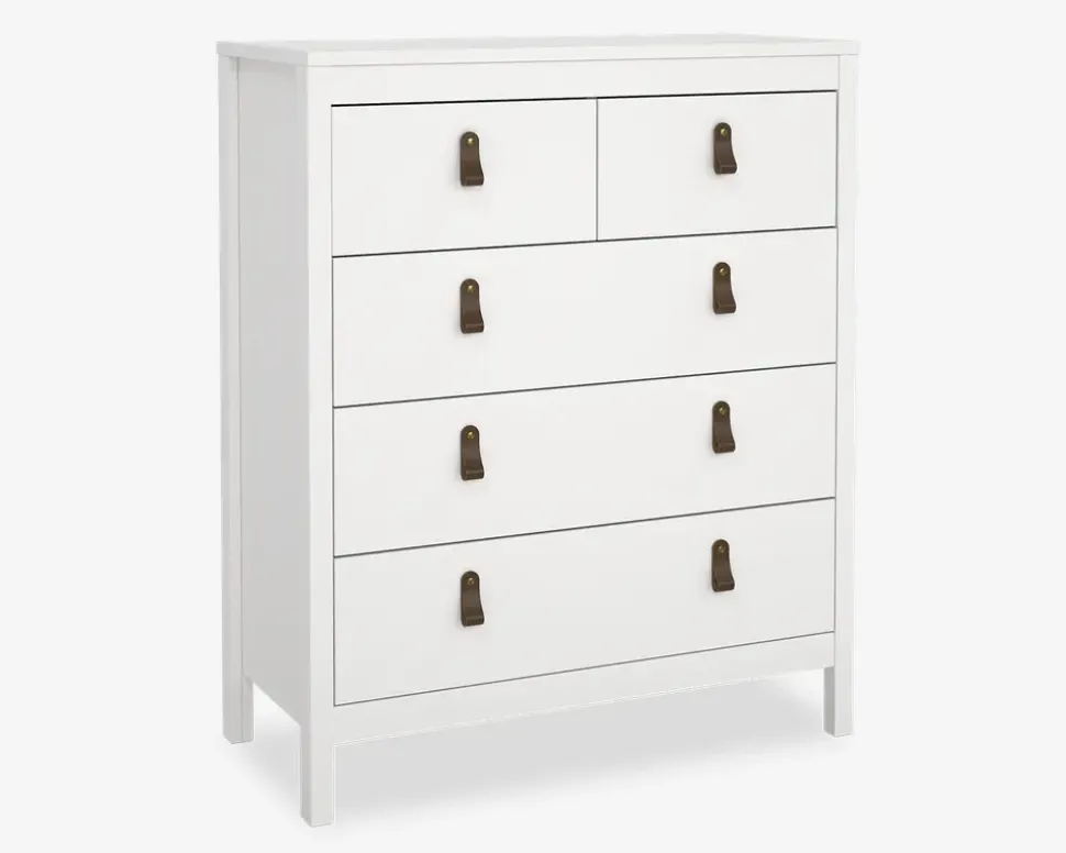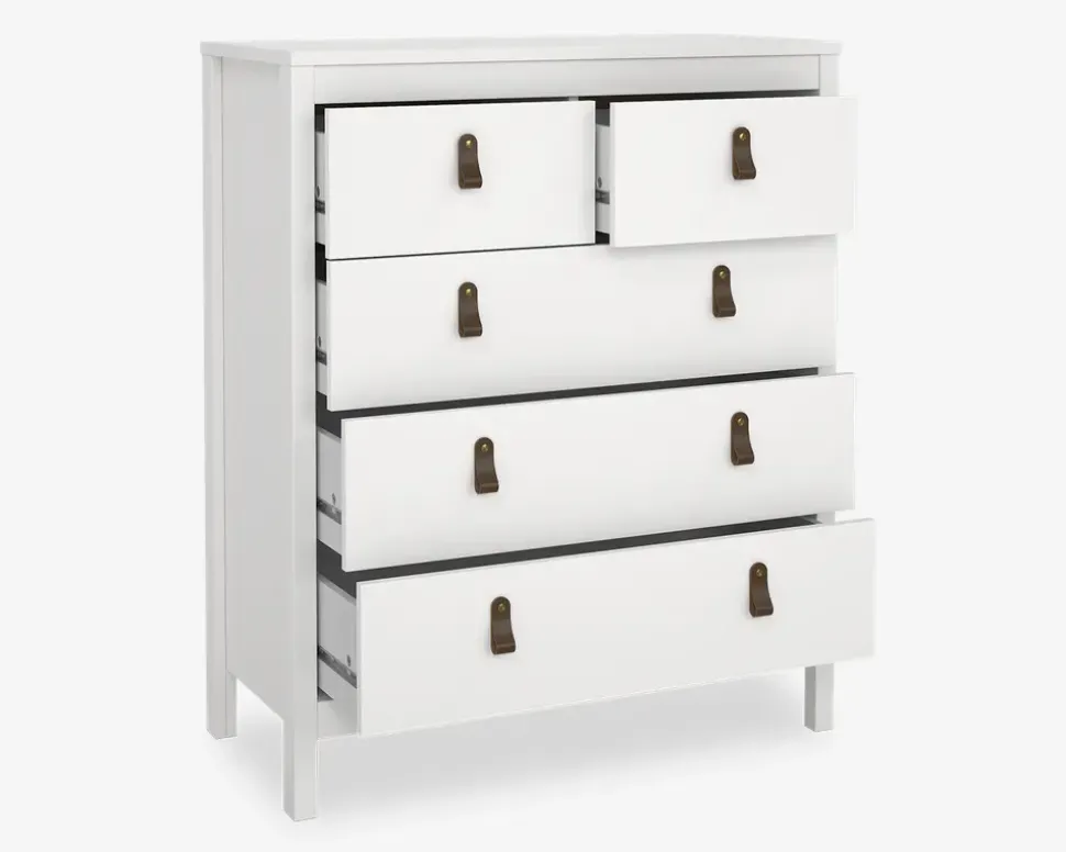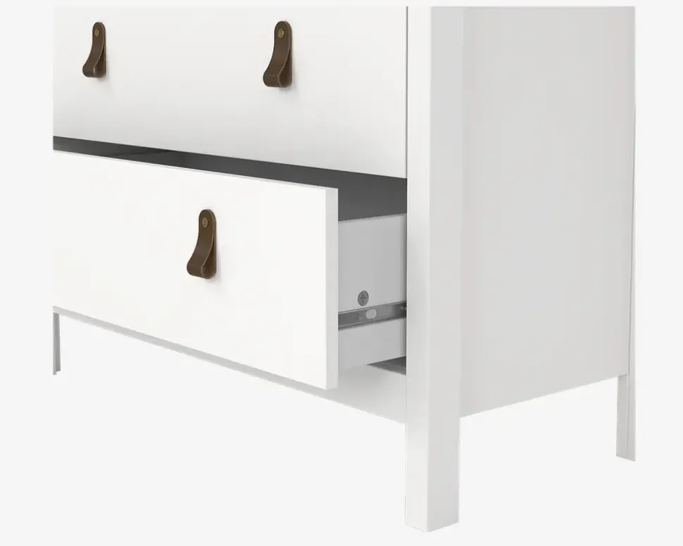 Her har du en flot dansk produceret kommodeserie, som findes i flere størrelser. Kommoden er fremstillet i hvid kunstfiner, den leveres med 2 greb henholdsvis et lædergreb eller et rundt metalgreb, hvilket du benytter er helt op til dig. Kommoden har et let kørende metaludtræk, og skufferne er rumlige og reelle, så der bliver plads til masser af tøj.Kommoden leveres usamlet, men hvis du følger den vedlagte samlevejledning og sætter lidt tid af, vil den kunne samles af alle. Hver skuffe kan belastes med 8 kg. Kommoden kræver ingen vedligeholdelse, og rengøreingen foretages med en klud vredet op i rent vand.