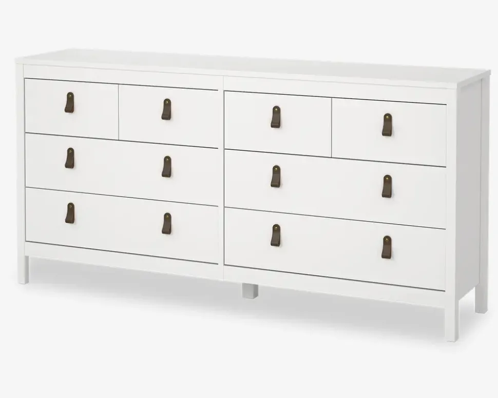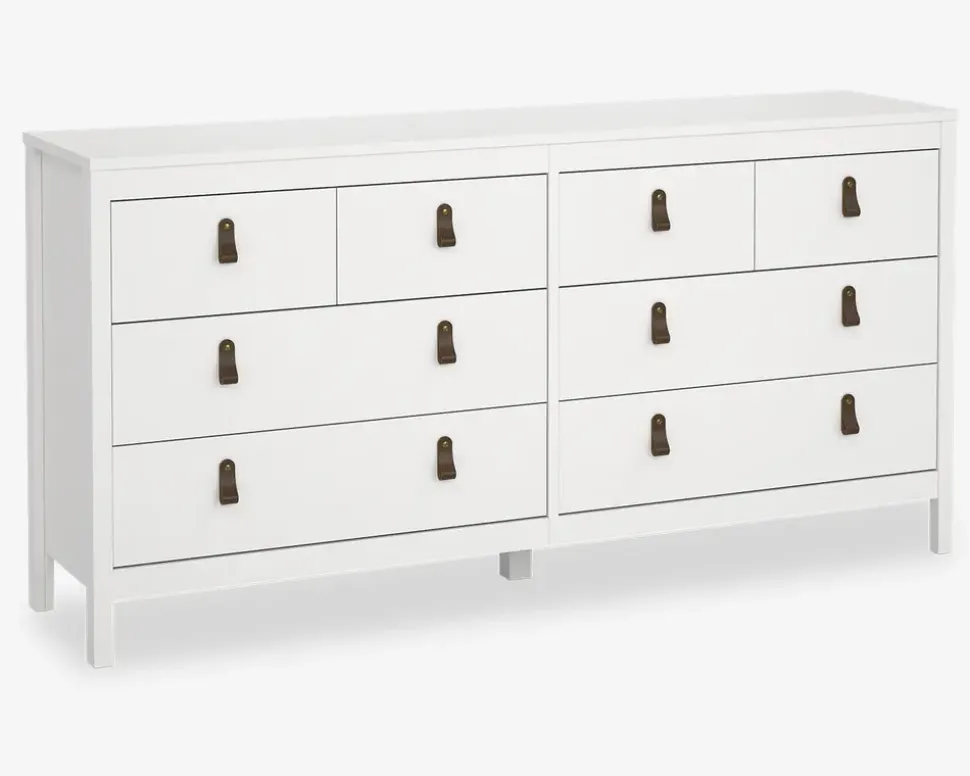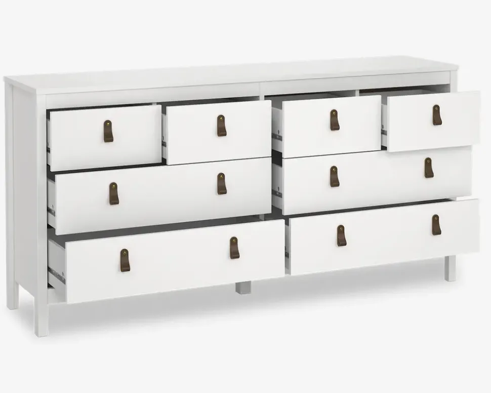 Her har du en flot dansk produceret kommodeserie, som findes i flere størrelser. Kommoden er fremstillet i hvid kunstfiner, den leveres med 2 greb henholdsvis et lædergreb eller et rundt metalgreb, hvilket du benytter er helt op til dig. Kommoden har et let kørende metaludtræk, og skufferne er rumlige og reelle, så der bliver plads til masser af tøj.Kommoden leveres usamlet, men hvis du følger den vedlagte samlevejledning og sætter lidt tid af, vil den kunne samles af alle. Hver skuffe kan belastes med 8 kg. Kommoden kræver ingen vedligeholdelse, og rengøreingen foretages med en klud vredet op i rent vand.