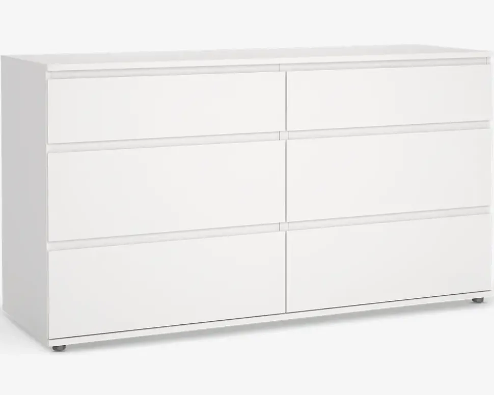 Denne kommode er en del af en kommode serie, som findes i forskellige størrelser. Denne kommodeserie er til dig som går op i de små detaljer, men samtidig har fokus på prisen. Du får i denne serie en flot kommode, hvor skufferne kører let på metaludtræk. Skufferne er grebsfri og den hvide kunstfiner er foldet omkring kanten, så du ikke for nogen synlige samlinger, eller kantlister. Foldemetoden samt en 45 vinkel i skuffefronten giver en behagelig greb når du skal åbne skuffen. Alle enhederne i denne serie giver dig høj værdi for pengene, og de er særdeles konkurrencedygtige i forhold til kvaliteten.Denne kommode har 3+3 rummelige skuffer. Den måler H.83,7 x B.153,4 x D.50 cm. Skufferne kører på metaludtræk med indbygget stop, så du ikke risikerer at tabe skuffen på gulvet. Kommoden leveres usamlet, men samles let, hvis du følger den vedlagte samlevejledning. I samme serie findes en bred kommode med henholdsvis 5 og 3 skuffer, en smal kommode med 5 skuffer, samt et sengebord med 2 skuffer.• Metaludtræk med stop• Skufferne kan bære 9 kg• Topplade kan bære 35 kg• Mål i cm: H.83,7 x B.153,4 x D.50• Leveres usamlet