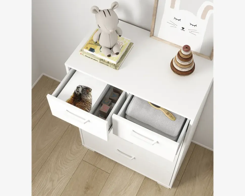 Kommodeserien Sofia er en serie af kommoder i forskellig størrelse, som med sit minimalistiske design vil passe perfekt ind i mange moderne hjem. Kommoden er velegnet i børne/ungdoms værelset, men kan også bruges andre steder i hjemmet, hvor der er behov for opbevaring. Hver skuffe kan belastes med en vægt på op til 9 kg. Sofia kommoden er fremstillet af spånplade med hvid kunstfiner, det giver en både robust og rengøringsvenlig overflade. Overfladen aftørres med en fugtig klud, og derudover kræver kommoden ikke vedligeholdelse.