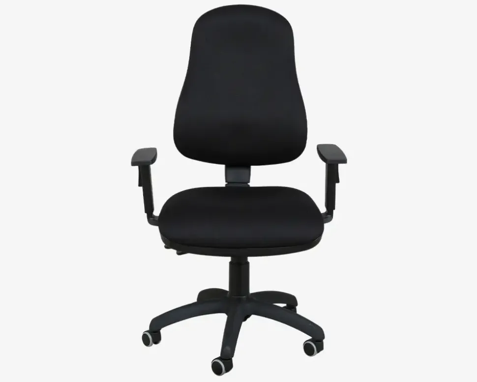 Kontorstolen her er designet og fremstillet til kontorbrug eller lidt mere krævende hjemmebrug. Kontorstolen har et ergonomisk udformet ryglæn med fremhævede sidestøtter, som giver god støtte til ryggen. Ryglænets højde og hældning kan justeres under sædet. Kontorstolen har justerbar sædehøjde med gaspumpe. Sædet er lavet af kraftig krydsfiner, ergonomisk polstret, hvor de formede ekstra sidestøtter giver ekstra komfort, når du sidder i stolen. Kontorstolen har højdejusterbare armlæn og den har gummihjul, som er velegnet til hårde gulve. Stof i vandafvisende polyester. Stolen har ASY funktion, som betyder, at sæde og ryglæn kan bevæge sig uafhængigt af hinanden. • Ergonomisk udformet sæde og ryglæn• Formstabilt polyetherskum• Justerbar sædehøjde med gaspumpe• Gummihjul velegnet til hårde gulve• Højdejusterbare armlæn• Vandafvisende polyester stof• Sædehøjde i cm. H.43-55• Mål i cm. B.52 x D.48 x H.110-122