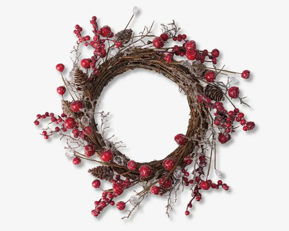Dekorativ krans med røde bær og en diameter på 30 cm. En klassisk og hyggelig juledekoration, der kan hænges på døren, i vinduet eller bruges som del af en bordopstilling. Den skaber julestemning og er i plastik, hvilke gør at den kan bruges år efter år.