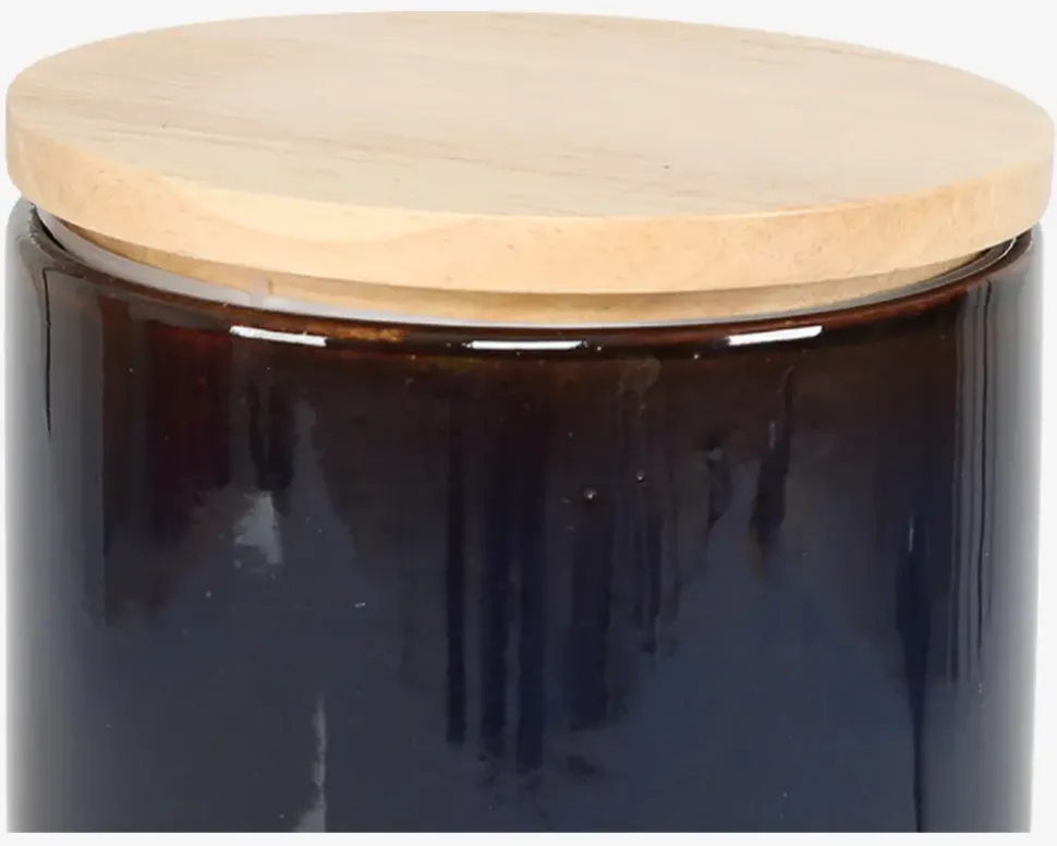Krukke med trælåg. Brug den til at opbevare forskellige tørvarer, opvasketabs eller andre ting. Kombiner gerne krukken med stel i samme farve eller mix den med nogle af vores andre fine stel. • Mål i cm: H.15