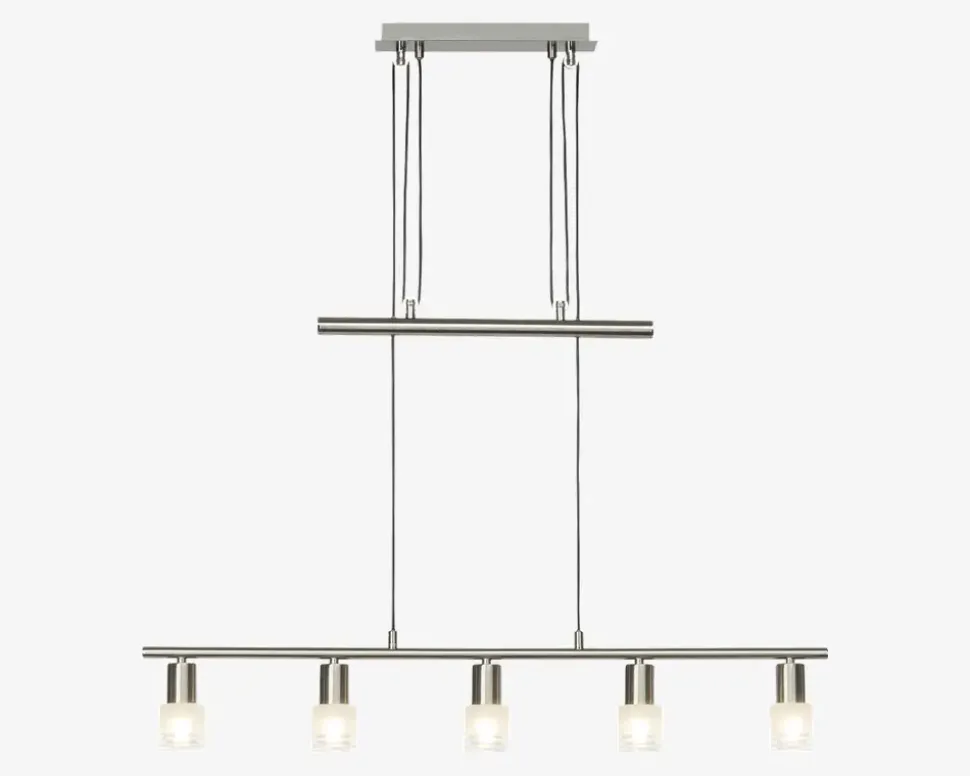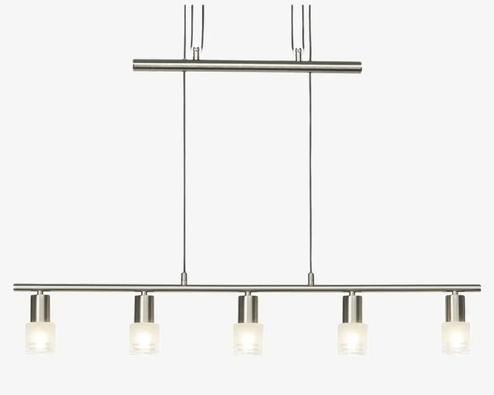 Klassisk og enkel langbordspendel fra Brilliant. Lea passer perfekt over spise- eller køkkenbordet.Mulighed for at højdejustere pendlen.• Mål i cm: H.173, L.90,• Farve: Krom/Hvid• Materiale: Metal/Glas• Fatningstype: 5 x E14 max 4W• Inkl. lyskilder: Ja