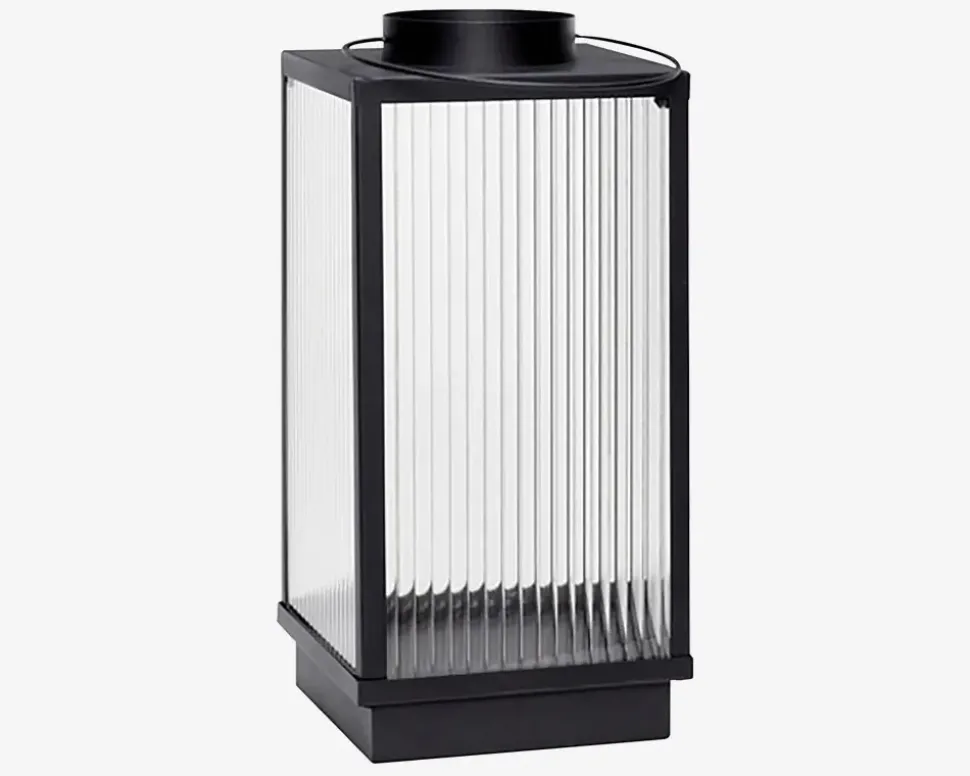 Denne elegante lanterne i sort metal vil tilføje en stemningsfuld atmosfære til dit hjem. Med sine rillede glaspaneler giver den et smukt lysglimt, når et stearinlys placeres indeni. Lanterne er 35 cm høj, hvilket gør den til den perfekte dekoration på et bord eller en hylde i stuen, på badeværelset eller soveværelset. • Mål i cm: H.35 x L.17 x B.17
