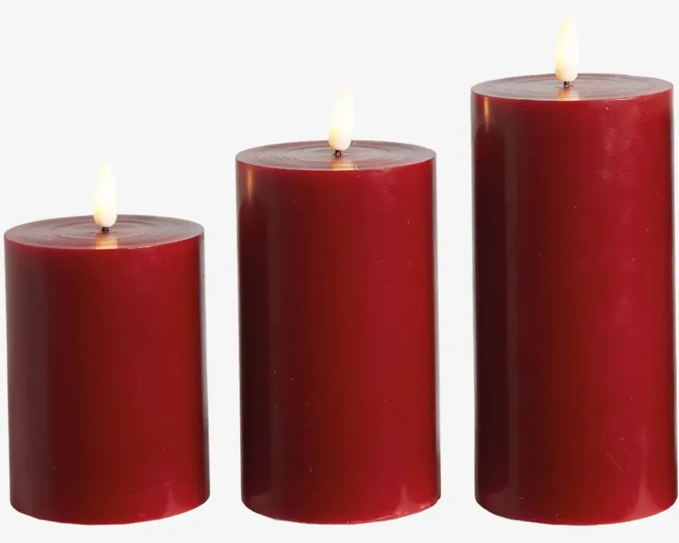 Dette LED-bloklys-sæt er det ideelle valg til at skabe en hyggelig stemning i dit hjem. Sættet indeholder tre LED-bloklys og en praktisk fjernbetjening, der giver dig fuld kontrol over belysningen. Hvert bloklys er designet til at efterligne ægte stearinlys og har en realistisk 3D-flamme, der skaber en varm og indbydende atmosfære. De blafrende flammer giver en beroligende effekt, og du kan nyde den hyggelige stemning uden bekymring for brandfare eller dryppende voks. Med den medfølgende fjernbetjening kan du nemt betjene bloklysene. Du kan tænde eller slukke dem, justere lysstyrken og endda vælge mellem forskellige lysfunktioner som blafrende eller kontinuerlig belysning. Det giver dig mulighed for at tilpasse belysningen efter dit behov og skabe den perfekte stemning.• Mål i cm: H.15/12,5/10 x Ø.7,5 • Farve: Rød• Lys: Varm hvid• Batteri: 3xAAA pr. lys, ekskl.• Inkl. fjernbetjening, (Batteri 1xCR2025, inkl.)