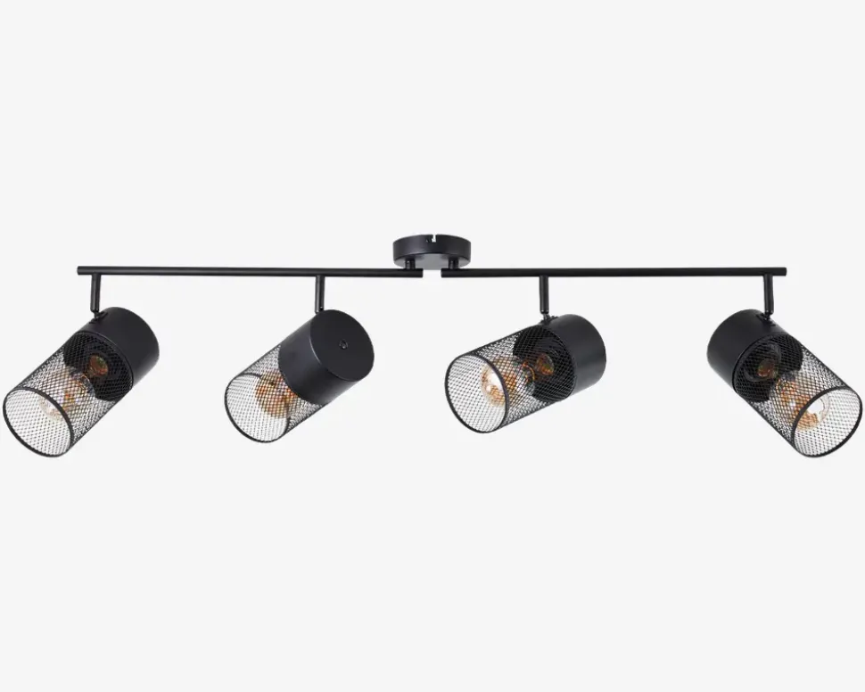 Loftspot Kamolo har et tidløst og elegant design, der passer godt ind i moderne og minimalistiske indretningsstile. Den vil tilføje et strejf af elegance til ethvert rum og være et iøjnefaldende element i din indretning. Lampen har 4 justerbare spots, så du kan rette lyset i den retning du ønsker. • Mål i cm: H.25 x B.108 x D.10• Farve: Sort • Materiale: Metal• Fatning: E27, maks 4x40W, ekskl.
