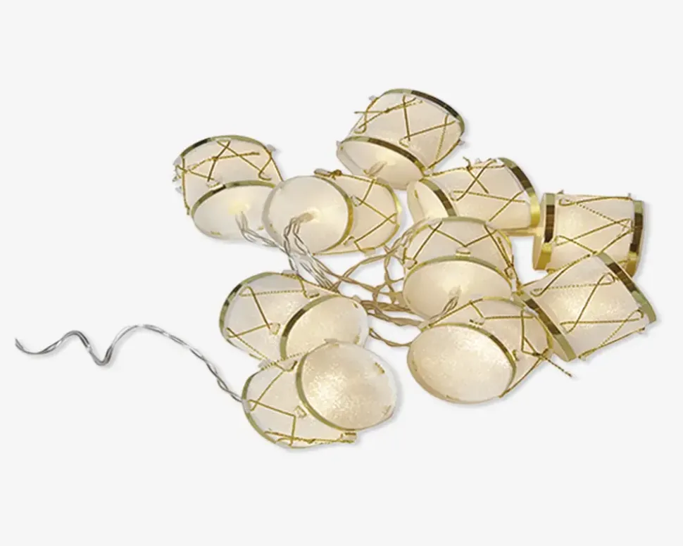 Lyskæde med 10 trommer der skaber en hyggelig stemning. Bruger batterier og har timer. Husk derfor at tilkøbe 2 x AAA batterier.