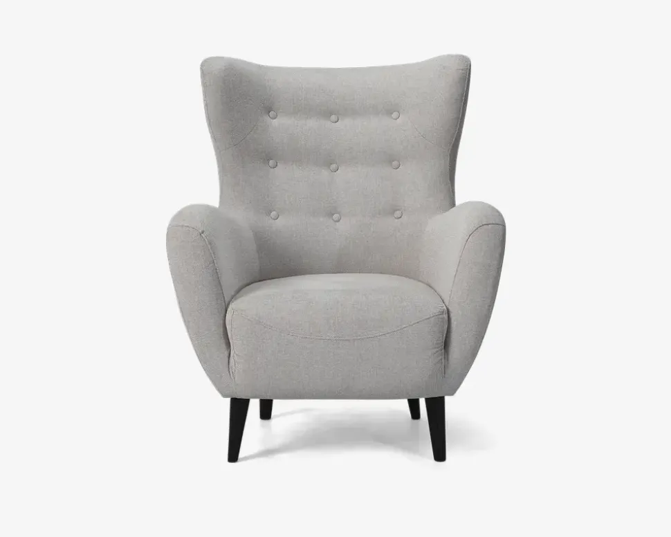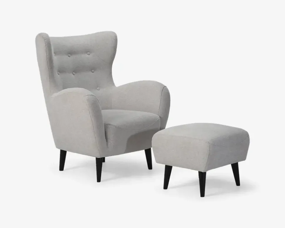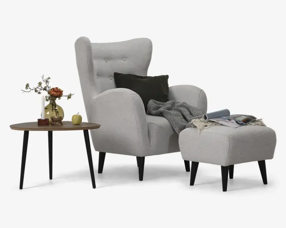 Flot, hyggelig lænestol med øreklapper i et design der giver stolen et meget moderne look samtidig med at den har et twist af retro stilen. Stolen kan fås med slidstærkt møbelstof i lys blå, antracit og beige som her, eller i en lækker velour i grå og grøn. Der forefindes sofaer i samme farver. Lænestolen har posefjedre i sædet som giver en rigtig god siddekomfort og den har nozagfjedre i sæderammen som giver en rigtig god stabilitet. Lænestolen leveres inklusiv den flotte fodskammel som gør at man rigtig kan slappe af og samtidig kan den give en ekstra siddeplads ved sofabordet når man er mange samlet. Lænestolen har sortlakerede massive træben, som passer til det meste.• Posefjedre i sæder• Nozagfjedre i sæderammen• Slidstærkt møbelstof• Fantastisk siddekomfort• Moderne retro look• Stol: Mål i cm: B.88 x D.88 x H.44/107• Fodskammel: Mål i cm: B.52 x D.52 x H.42