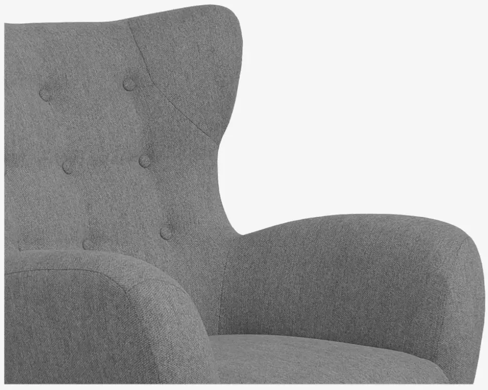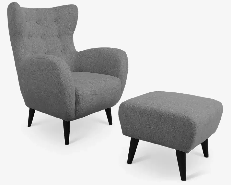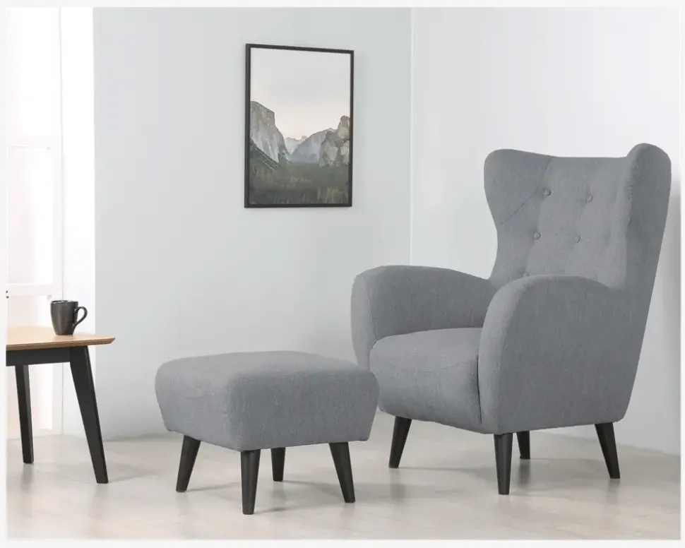 Flot, hyggelig lænestol med øreklapper i et design der giver stolen et meget moderne look samtidig med at den har et twist af retro stilen. Stolen kan fås med slidstærkt møbelstof i lys blå, antracit og beige, eller i en lækker velour i grå og grøn. Der forefindes sofaer i samme farver. Lænestolen har posefjedre i sædet som giver en rigtig god siddekomfort og den har nozagfjedre i sæderammen som giver en rigtig god stabilitet. Lænestolen leveres inklusiv den flotte fodskammel som gør at man rigtig kan slappe af og samtidig kan den give en ekstra siddeplads ved sofabordet når man er mange samlet. Lænestolen har sortlakerede massive træben, som passer til det meste.• Posefjedre i sæder• Nozagfjedre i sæderammen• Slidstærkt møbelstof• Fantastisk siddekomfort• Moderne retro look• Stol: Mål i cm: B.88 x D.88 x H.44/107• Fodskammel: Mål i cm: B.52 x D.52 x H.42
