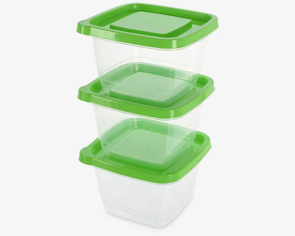 Opbevaringsboks sæt med 3 kasser i klar plast med grønt låg. Madvarerne opbevares optimalt i denne lufttætte beholder og de er særligt velegnet til fryser og køleskab. Nemt og hurtigt at rengøre ved maskinopvask. Kommer i sæt med 3 stk.
